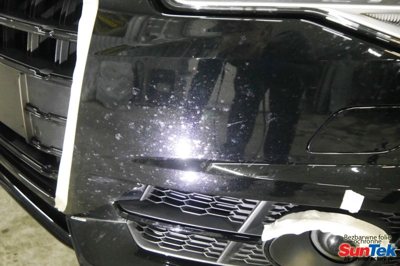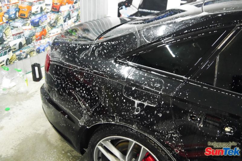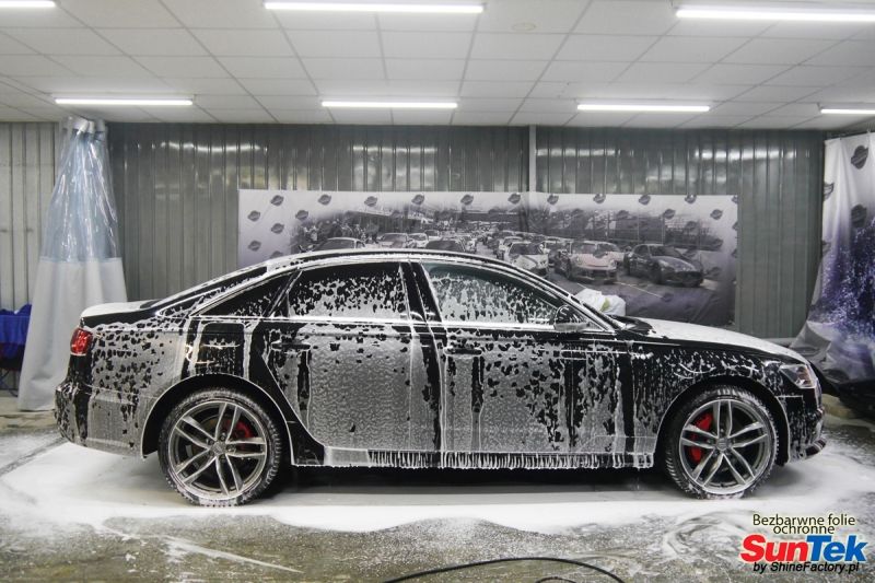 Zabezpieczenie frontów aut bezbarwnymi foliami ochronnymi staje się powoli standardem, coraz częściej także zabezpieczane w ten sposób są auta w całości co daje do tego czasu nieosiągalne perfekcyjne zabezpieczenie i efekt wizualny. Tym razem mieliśmy przyjemność zająć się Audi A6, które posiadało już dość niewielki przebieg. Auto choć z niewielkim przebiegiem posiadało już dużą ilość niedoskonałości, zmatowienie, zarysowania, obcierki, odpryski na przodzie, dlatego właściciel chciał w najlepszy możliwy sposób zabezpieczyć nadwozie na lata aby uszkodzenia te już nie groziły. Decyzja padła oczywiście na połączanie znakomitych bezbarwnych folii ochronnych SunTek Ultra PPF z 10 letnią gwarancją oraz pakietu powłok ceramicznych. Standardowo prace zaczęliśmy od bardzo dokładnego oczyszczenia nadwozia z wszelkich naleciałości oraz detailingu kół i nadkoli. Następnie po inspekcji usunęliśmy wszelkie niedoskonałości lakieru jak mocne zmatowienie i liczne zarysowania. Po przygotowaniu przeszliśmy do zabezpieczenia auta, najpierw aplikując bezbarwne folie ochronne. Folie zazwyczaj aplikuje się na najbardziej narażone el. auta jak przód, tym razem zdecydowaliśmy się praktycznie całe auto pokryć najlepszymi na świecie regeneracyjnymi foliami SunTek Ultra aby uzyskać 100% ochronę lakieru, który będzie całkowicie izolowany od środowiska zewnętrznego i nic nie będzie wstanie go uszkodzić. Po aplikacji folii przeszliśmy do zabezpieczania wszelkich el. auta powłokami, zaaplikowaliśmy pakiet powłok na całe auto, folie, szyby (Gtechniq G1), felgi (DLUX), elementy nielakierowane. Nie pominęliśmy zajęcia się wnętrzem które zostało dokładnie oczyszczone i zaimpregnowane w każdym detalu różnymi kosmetykami skupiając się na impregnacji delikatnych skór. Po kilkudziesięciu godzinach pracy Audi nabrało perfekcyjnego wyglądu, połysku oraz co najważniejsze najmocniejszej praktycznie pancernej ochrony na lata. Zapraszamy do szerokiej fotorelacji!
