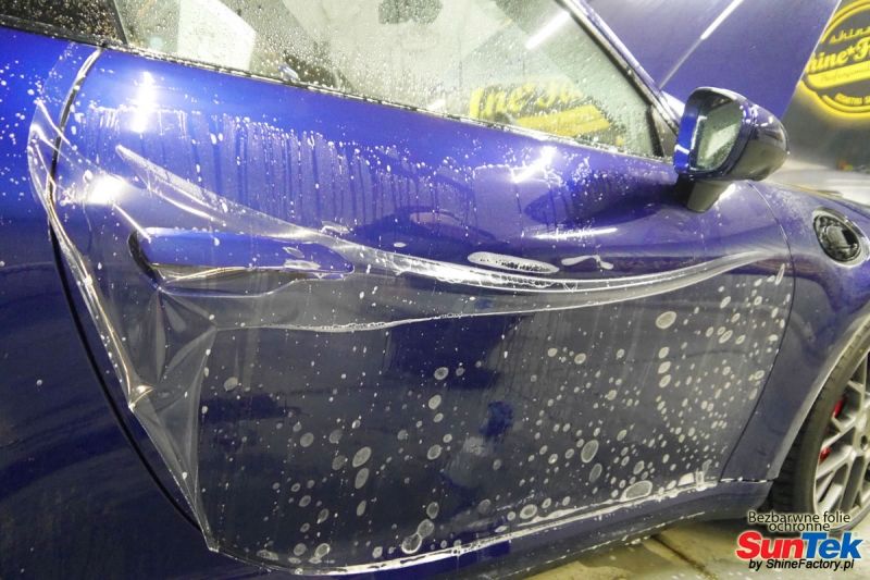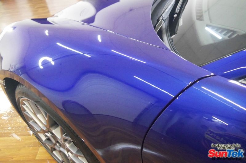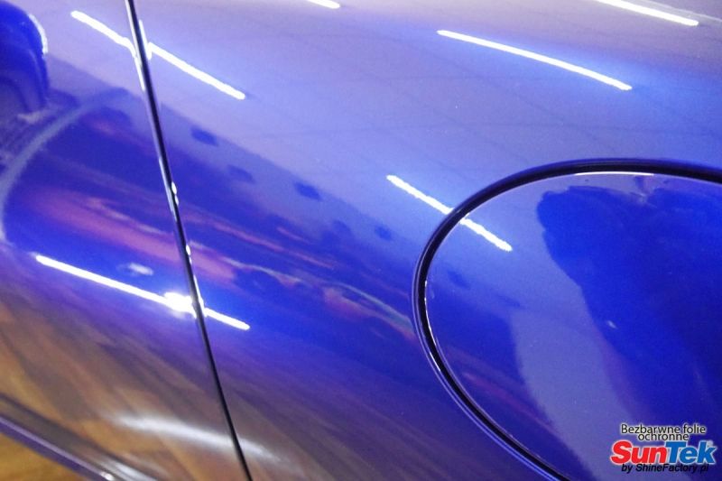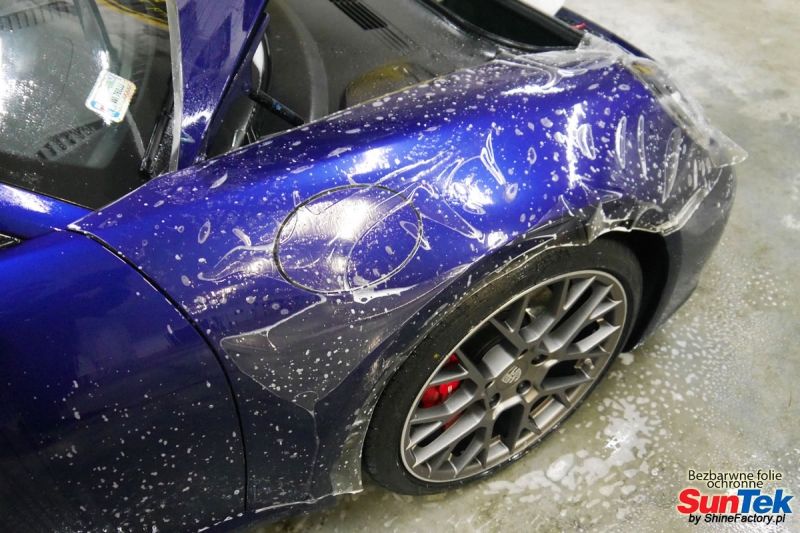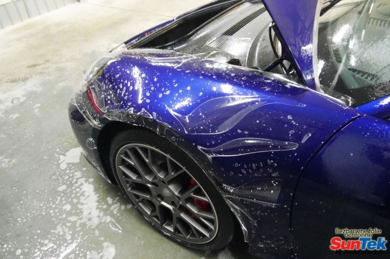 Zabezpieczenie frontów aut bezbarwnymi foliami ochronnymi staje się powoli standardem, coraz częściej także zabezpieczane w ten sposób są auta w całości co daje do tego czasu nieosiągalne perfekcyjne zabezpieczenie i efekt wizualny. Tym razem mieliśmy przyjemność zająć się najnowszą odsłoną Porsche 911 czyli modelem 992 w pięknym niebieskim metalicznym kolorze, które trafiło do nas wprost z salonu w celu najlepszego na świecie zabezpieczenia całego auta. Decyzja padła oczywiście na połączanie znakomitych bezbarwnych folii ochronnych SunTek Ultra PPF z 10 letnią gwarancją oraz pakietu powłok ceramicznych. Standardowo prace zaczęliśmy od bardzo dokładnego oczyszczenia nadwozia z wszelkich naleciałości. Następnie po inspekcji usunęliśmy wszelkie niedoskonałości lakieru. Po przygotowaniu przeszliśmy do zabezpieczenia auta, najpierw aplikując bezbarwne folie ochronne. Folie zazwyczaj aplikuje się na najbardziej narażone el. auta jak przód, tym razem zdecydowaliśmy się praktycznie całe auto pokryć najlepszymi na świecie regeneracyjnymi foliami SunTek Ultra aby uzyskać 100% ochronę lakieru, który będzie całkowicie izolowany od środowiska zewnętrznego i nic nie będzie wstanie go uszkodzić. Po aplikacji folii przeszliśmy do zabezpieczania wszelkich el. auta powłokami, zaaplikowaliśmy pakiet powłok na całe auto, folie, szyby (Gtechniq G1), felgi (DLUX), elementy nielakierowane, a także całe wnętrze wraz z zaimpregnowaniem delikatnych skór. Po kilkudziesięciu godzinach pracy Porsche nabrało perfekcyjnego wyglądu, połysku oraz co najważniejsze najmocniejszej praktycznie pancernej ochrony na lata. Zapraszamy do szerokiej fotorelacji!