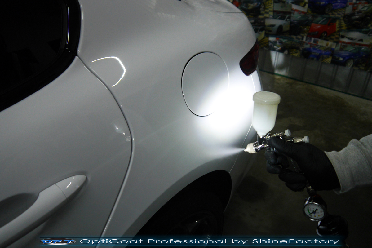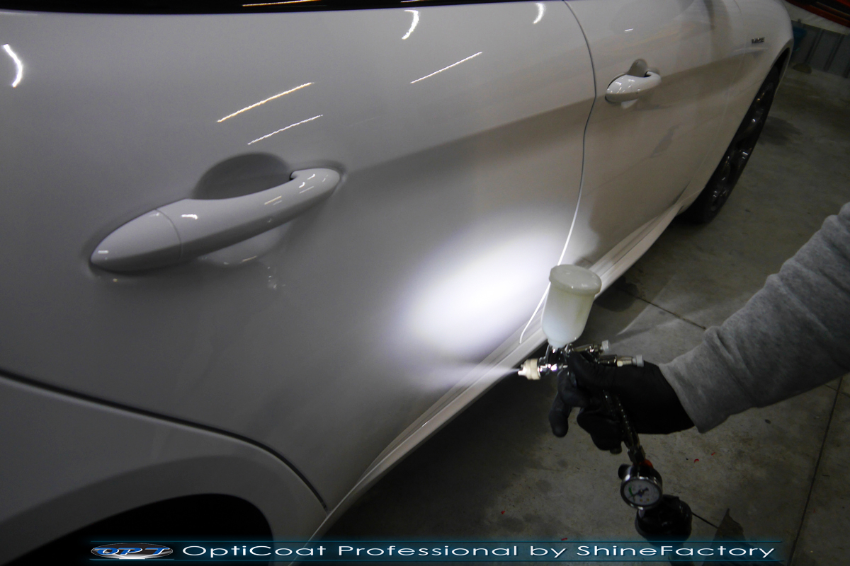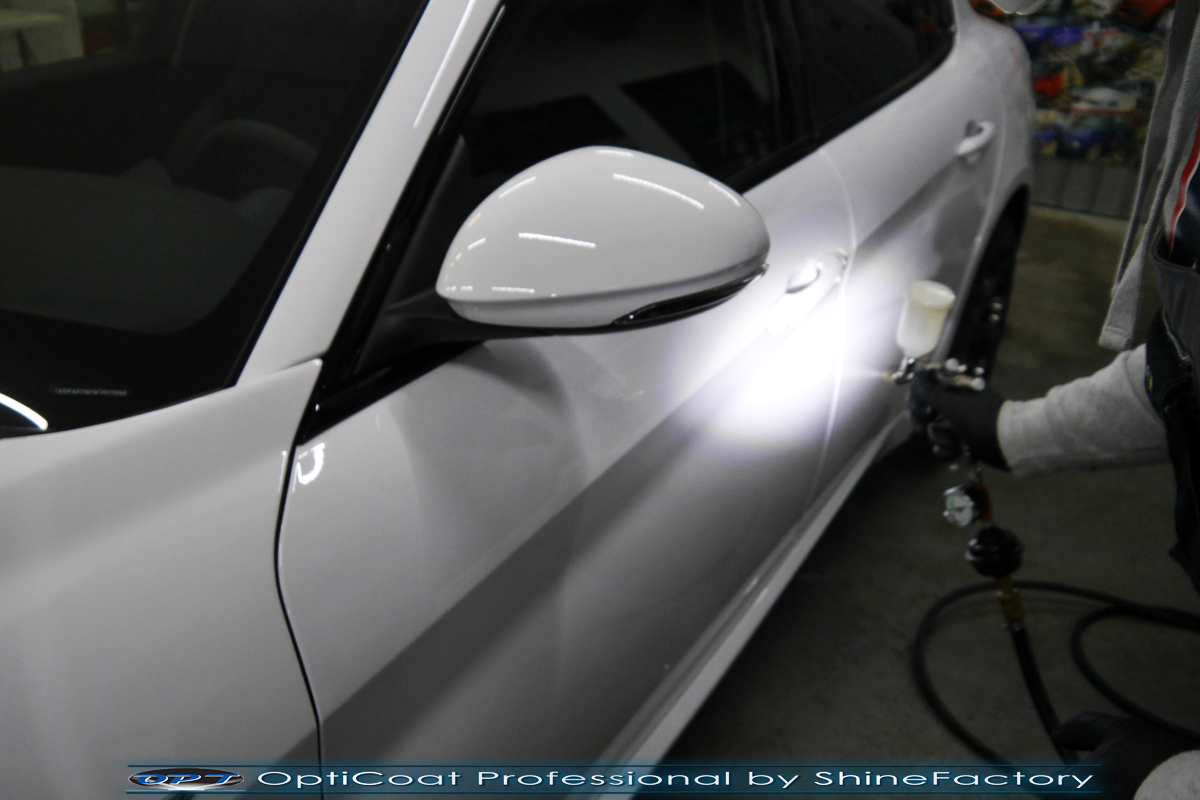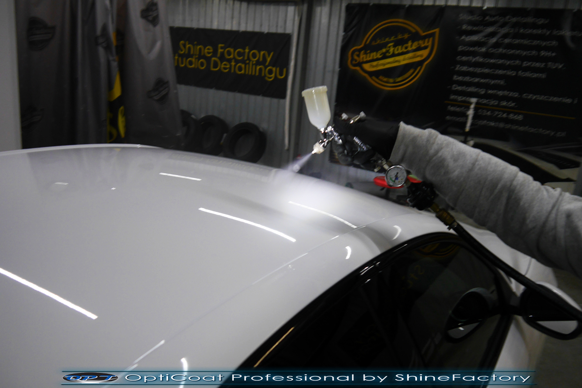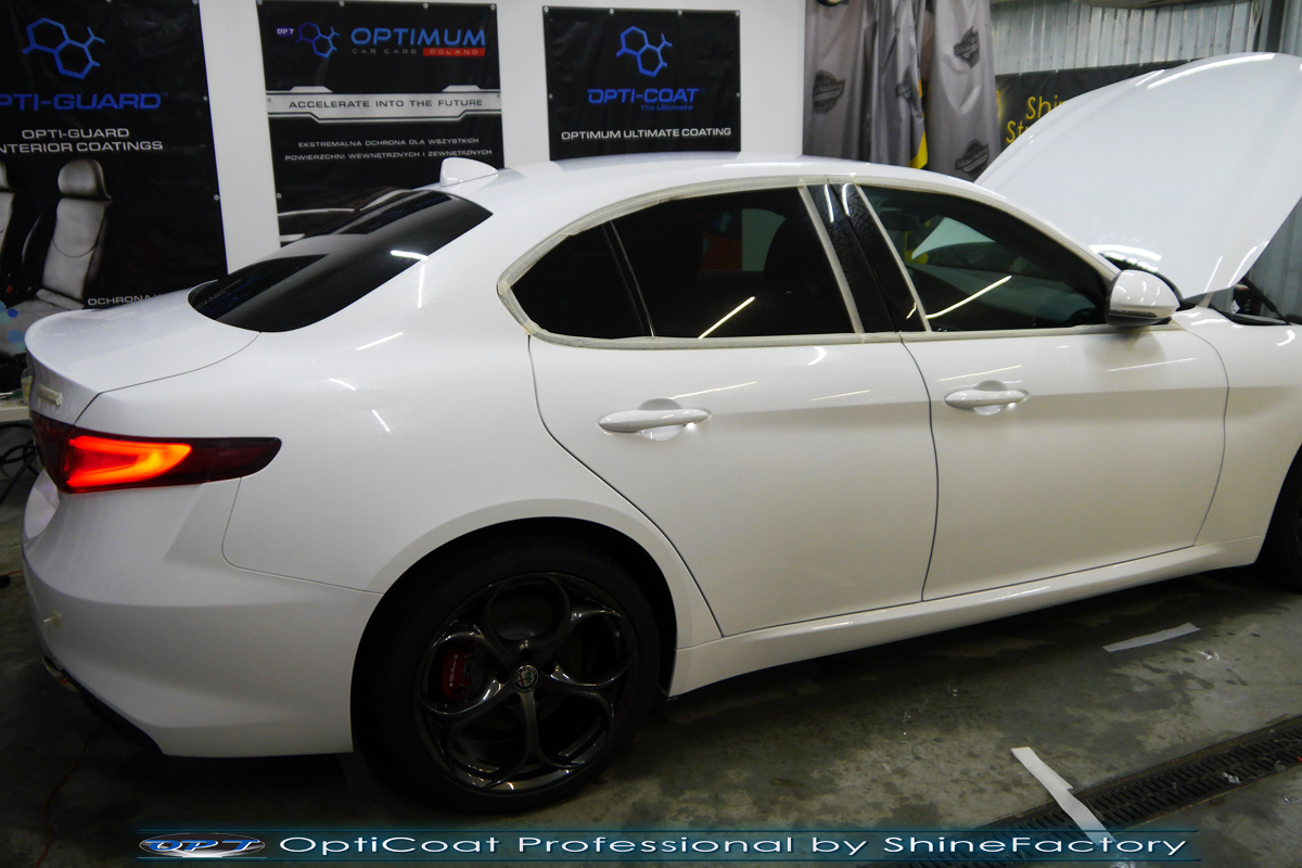 Połączenie bezbarwnych samo-regeneracyjnych folii oraz powłok ceramicznych staje się powoli standardem w idealnym zabezpieczeniu nowego auta. Tym razem mieliśmy przyjemność zająć się nową piękną Alfa Romeo Giulia, która trafiła do nas wprost po wyjeździe z salonu. Auto zostało maksymalnie zabezpieczone przed wszystkimi możliwymi uszkodzeniami. Wykorzystane do tego zostały najlepsze na rynku bezbarwne folie ochronne SunTek Ultra PPF oraz natryskowa ceramika OptiCoat PRO. Oczywiście prace rozpoczęliśmy od dokładnego oczyszczenia całego nadwozia z naleciałości a następnie przeprowadziliśmy korektę aby usunąć delikatne posalonowe niedoskonałości. Następnie przystąpiliśmy do aplikacji bezbarwnych folii ochronnych na najbardziej narażone na mocne uszkodzenia el. auta, oczywiście zdecydowaliśmy się jak zawsze wybrać produkt bezkonkurencyjny i nowoczesny na rynku, czyli folie regeneracyjne SunTek Ultra PPF. Po aplikacji folii przeszliśmy do zabezpieczania wszelkich el. auta powłokami, zaaplikowaliśmy w natryskowy sposób grubą warstwę powłoki 9H+ Optimum OptiCoat Professional potwierdzoną testami TUV, pokrywając ją dla maksymalnego efektu wizualnego powłoką GlossCoat, która na końcu została utwardzona w odpowiedniej temp. lampami IR. Oczywiście zajęliśmy się, także zabezpieczeniem pakietem powłok wszelkich innych elementów jak szyby (Gtechniq G1), felgi (DLUX), lampy czy elementy nielakierowane . Nie pominęliśmy zajęcia się wnętrzem aby zabezpieczyć je w każdym detalu różnymi kosmetykami skupiając się na impregnacji delikatnych skór. Po kilkudziesięciu godzinach pracy Giulia nabrała perfekcyjnego wyglądu, połysku oraz co najważniejsze najmocniejszej praktycznie pancernej ochrony na lata. Zapraszamy do szerokiej fotorelacji!