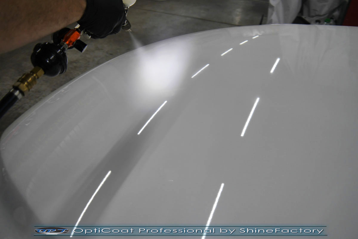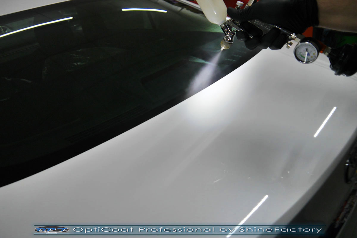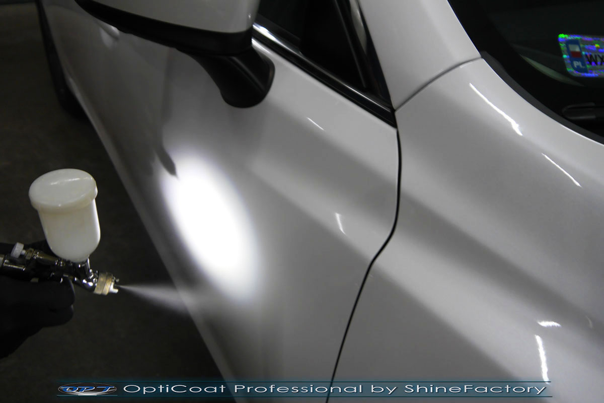 Zapraszamy Państwa do fotorelacji z prac nad Mazda 6 w pięknym aczkolwiek bardzo delikatnym białym perłowym lakierze. Auto zostało nam oddane niedługo po wyjeździe z salonu w celu jak najgrubszego i jak najmocniejszego możliwego zabezpieczenia pakietem powłok ceramicznych. Mazda przeszła nasz szeroki pakiet prac dla nowego auta więc prócz zabezpieczenia kompletem ceramiki nadwozia, zdjęliśmy z auta koła w celu dokładnego detailingu nadkoli, wnętrza felg oraz zacisków hamulcowych. Całe wnętrze zostało zaimpregnowane kosmetykami najwyższej ligi, ze szczególną uwagą na impregnacje el. skórzanych. Prace nad nadwoziem rozpoczęliśmy od dokładnego oczyszczenia i odtłuszczenia, następnie lakier przeszedł delikatną korektę w celu uzyskania perfekcyjnego efektu finalnego. Po tych czynnościach przeszliśmy do aplikacji powłok na wszelkie elementy jak lakier, szyby (bezapelacyjnie najlepszą powłoką Gtechniq G1), lampy, felgi (pancerny CQ DLUX), detale itp itd. Najważniejsze, na sam lakier zaaplikowaliśmy maksymalnie grubą natryskową warstwę kompozytu ceramicznego (100% powłoki na aucie) opartego na SiC- OptiCoat Professional połączoną z powłoką GlossCoat, która zapewni ochronę, zminimalizowane brudzenie oraz ułatwione do maksimum mycie. Nie pominęliśmy zajęcia się komorą silnika aby na długi czas prezentowała się świeżo i schludnie. Dodatkowo klosze lamp, wnęki klamek, ranty drzwi oraz progi zewnętrzne zostały pokryte mocną bezbarwną folią ochronną. Finalnie całe auto zostało wygrzane lampami IR w odpowiedniej temperaturze w celu utwardzenia. Zapraszamy do szerokiej fotorelacji!