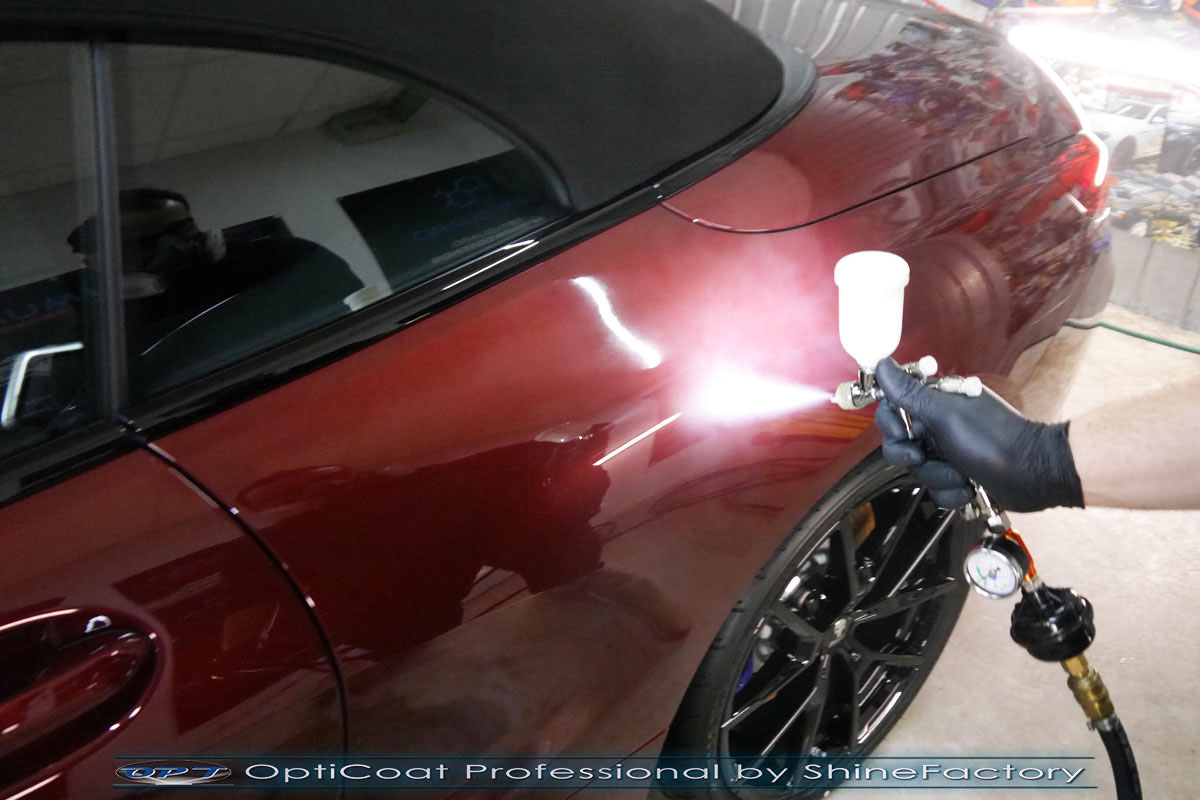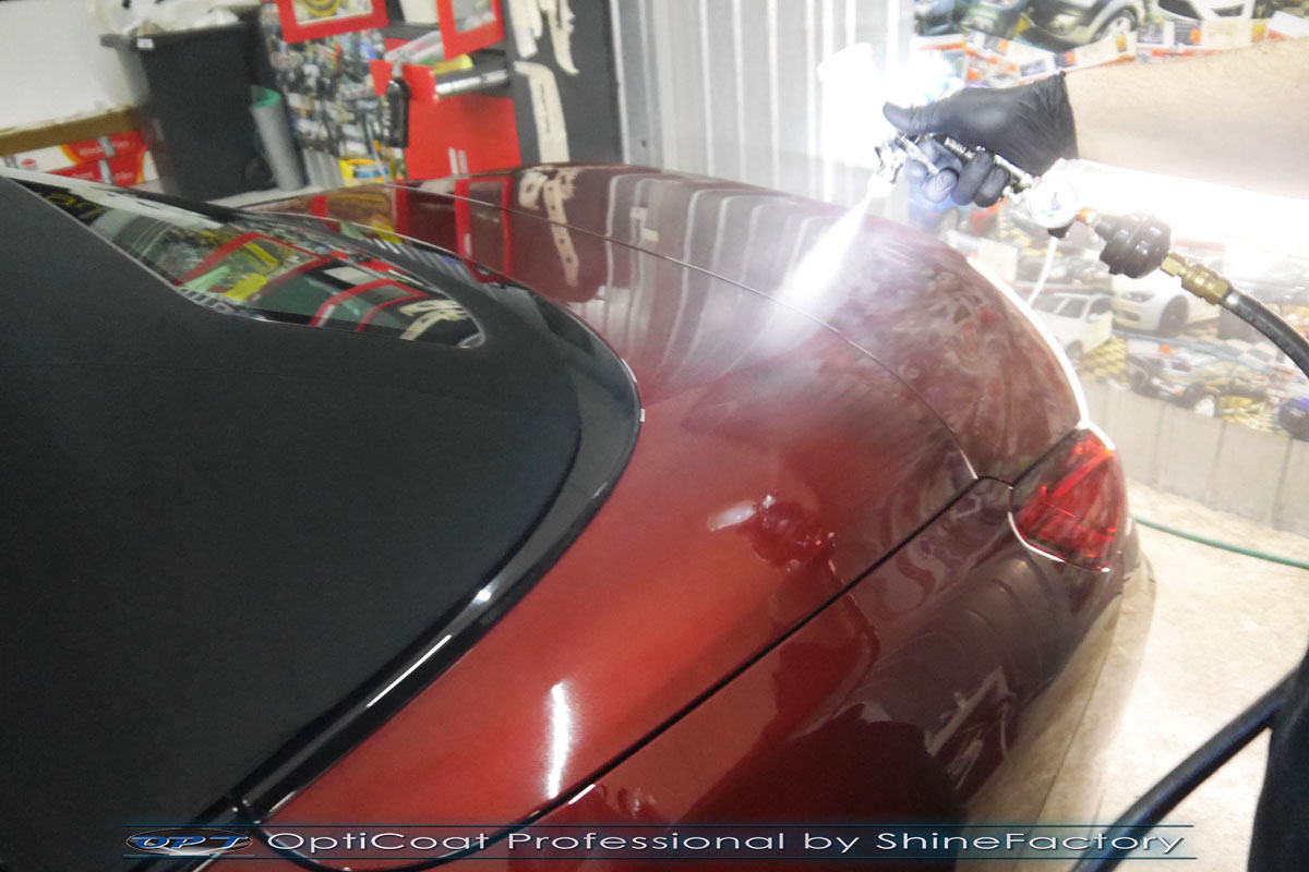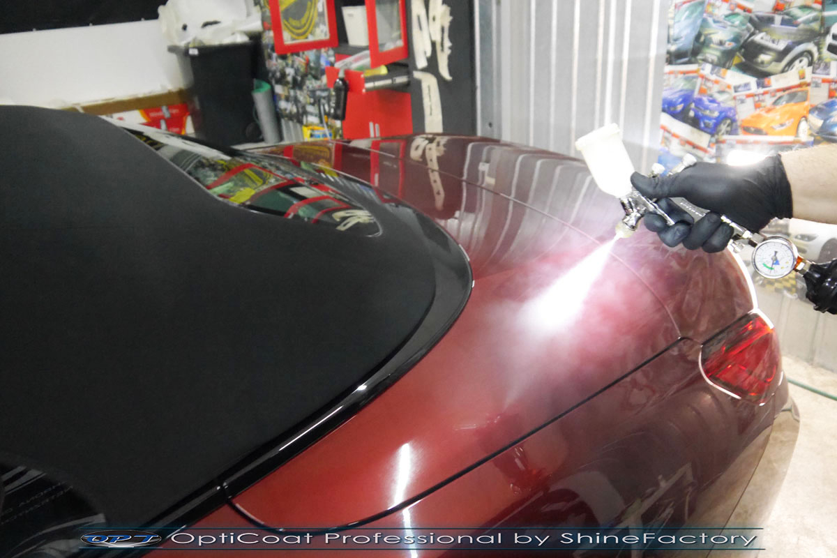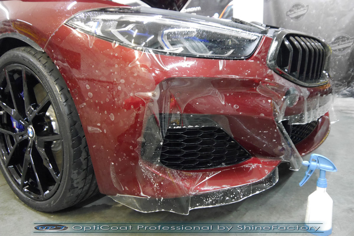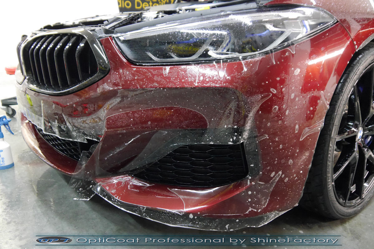Połączenie bezbarwnych samo-regeneracyjnych folii oraz powłok ceramicznych staje się powoli standardem w idealnym zabezpieczeniu nowego auta. Tym razem mieliśmy przyjemność zająć się nowym autem naszego stałego klienta, BMW 8 cabrio w indywidualnym kolorze lakieru. Auto zostało przez nas maksymalnie zabezpieczone przed wszystkimi możliwymi uszkodzeniami. Wykorzystane do tego zostały najlepsze na rynku bezbarwne folie ochronne SunTek Ultra PPF oraz natryskowa ceramika OptiCoat PRO. Oczywiście prace rozpoczęliśmy od dokładnego oczyszczenia całego nadwozia z naleciałości oraz delikatnej korekty lakieru w celu usunięcia posaloowych i potransportowych niedoskonałości (mikrorysy, wżery). Następnie przystąpiliśmy do aplikacji bezbarwnych folii ochronnych na najbardziej narażone na mocne uszkodzenia el. auta, oczywiście zdecydowaliśmy się jak zawsze wybrać produkt bezkonkurencyjny i nowoczesny na rynku, czyli folie regeneracyjne SunTek Ultra PPF. Po aplikacji folii przeszliśmy do zabezpieczania wszelkich el. auta powłokami, zaaplikowaliśmy w natryskowy sposób grubą warstwę powłoki 9H+ Optimum OptiCoat Professional potwierdzoną testami TUV, pokrywając ją dla maksymalnego efektu wizualnego powłoką GlossCoat, która na końcu została utwardzona w odpowiedniej temp. lampami IR. Oczywiście zajęliśmy się, także zabezpieczeniem pakietem powłok wszelkich innych elementów jak szyby (Gtechniq G1), felgi (DLUX), lampy czy elementy nielakierowane. W celu uzupełnienia kompleksowego detailingu zdjęliśmy z auta koła i zabezpieczyliśmy dokładnie zaciski hamulcowe, felgi oraz nadkola. Zajęliśmy się także wnętrzem, które zostało całościowo zabezpieczone wraz z impregnacją skór. Po kilkudziesięciu godzinach pracy BMW nabrało perfekcyjnego wyglądu, połysku oraz co najważniejsze najmocniejszej praktycznie pancernej ochrony na lata. Zapraszamy do szerokiej fotorelacji!