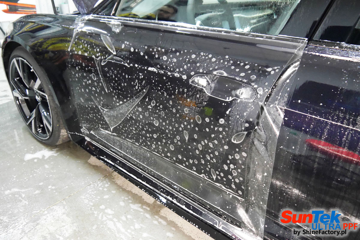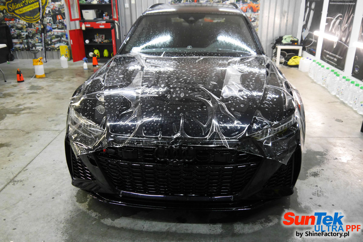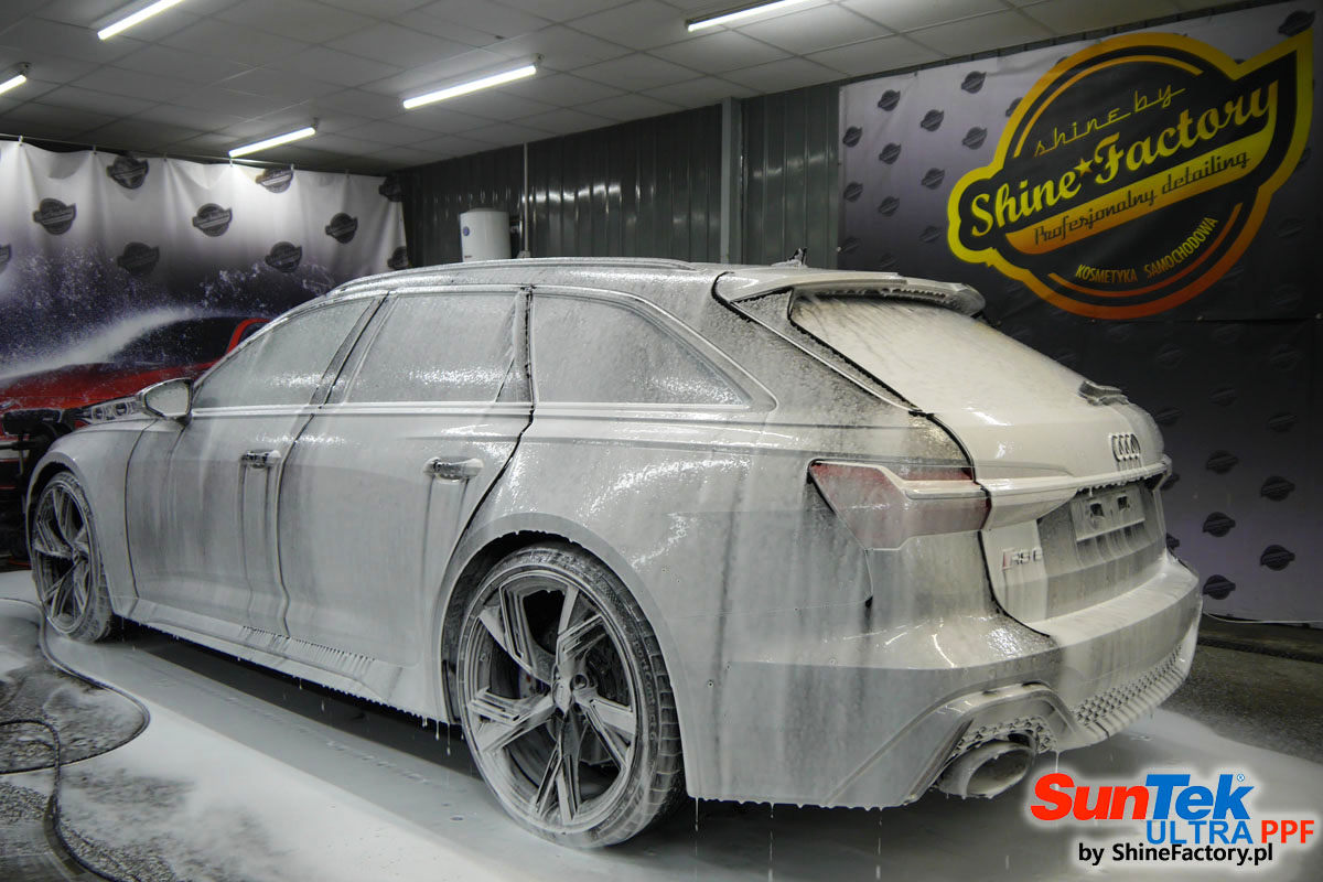 Zabezpieczenie frontów aut bezbarwnymi foliami ochronnymi staje się powoli standardem, coraz częściej także zabezpieczane w ten sposób są auta w całości co daje do tego czasu nieosiągalne perfekcyjne zabezpieczenie i efekt wizualny. Tym razem mieliśmy przyjemność zająć się najnowszą odsłoną Audi RS6, auto trafiło do nas z zerowym przebiegiem w celu najlepszego na świecie zabezpieczenia całego auta. Decyzja padła oczywiście na połączanie znakomitych bezbarwnych folii ochronnych SunTek Ultra PPF z 10 letnią gwarancją oraz pakietu powłok ceramicznych. Standardowo prace zaczęliśmy od bardzo dokładnego oczyszczenia nadwozia z wszelkich naleciałości. Kolejno zajęliśmy się inspekcją lakieru i skorygowaniem oraz doprowadzeniem go do perfekcji. (trzeba pamiętać iż auto od momentu produkcji do wydania klientowi przechodzi naprawdę dłuugą drogę). Po przygotowaniu przeszliśmy do zabezpieczenia auta, najpierw aplikując bezbarwne folie ochronne. Folie zazwyczaj aplikuje się na najbardziej narażone el. auta jak przód, tym razem zdecydowaliśmy się całe auto pokryć najlepszymi na świecie regeneracyjnymi foliami SunTek Ultra aby uzyskać 100% ochronę lakieru, który będzie całkowicie izolowany od środowiska zewnętrznego i nic nie będzie wstanie go uszkodzić. Po aplikacji folii przeszliśmy do zabezpieczania wszelkich el. auta powłokami, zaaplikowaliśmy pakiet powłok na całe auto, folie, szyby (Gtechniq G1), felgi (DLUX), elementy nielakierowane, a także całe wnętrze wraz z zaimpregnowaniem delikatnych skór. Po kilkudziesięciu godzinach pracy Audi nabrało perfekcyjnego wyglądu, połysku oraz co najważniejsze najmocniejszej praktycznie pancernej ochrony na lata. Zapraszamy do szerokiej fotorelacji!