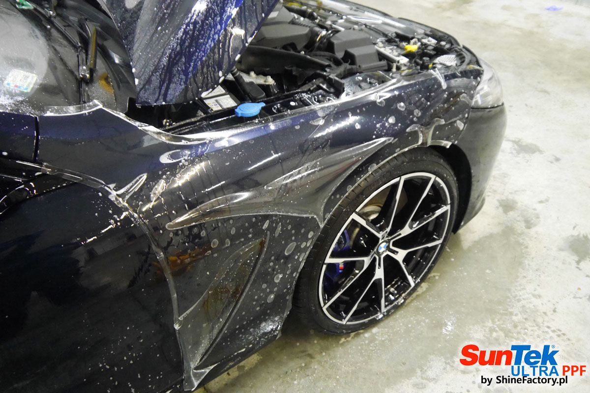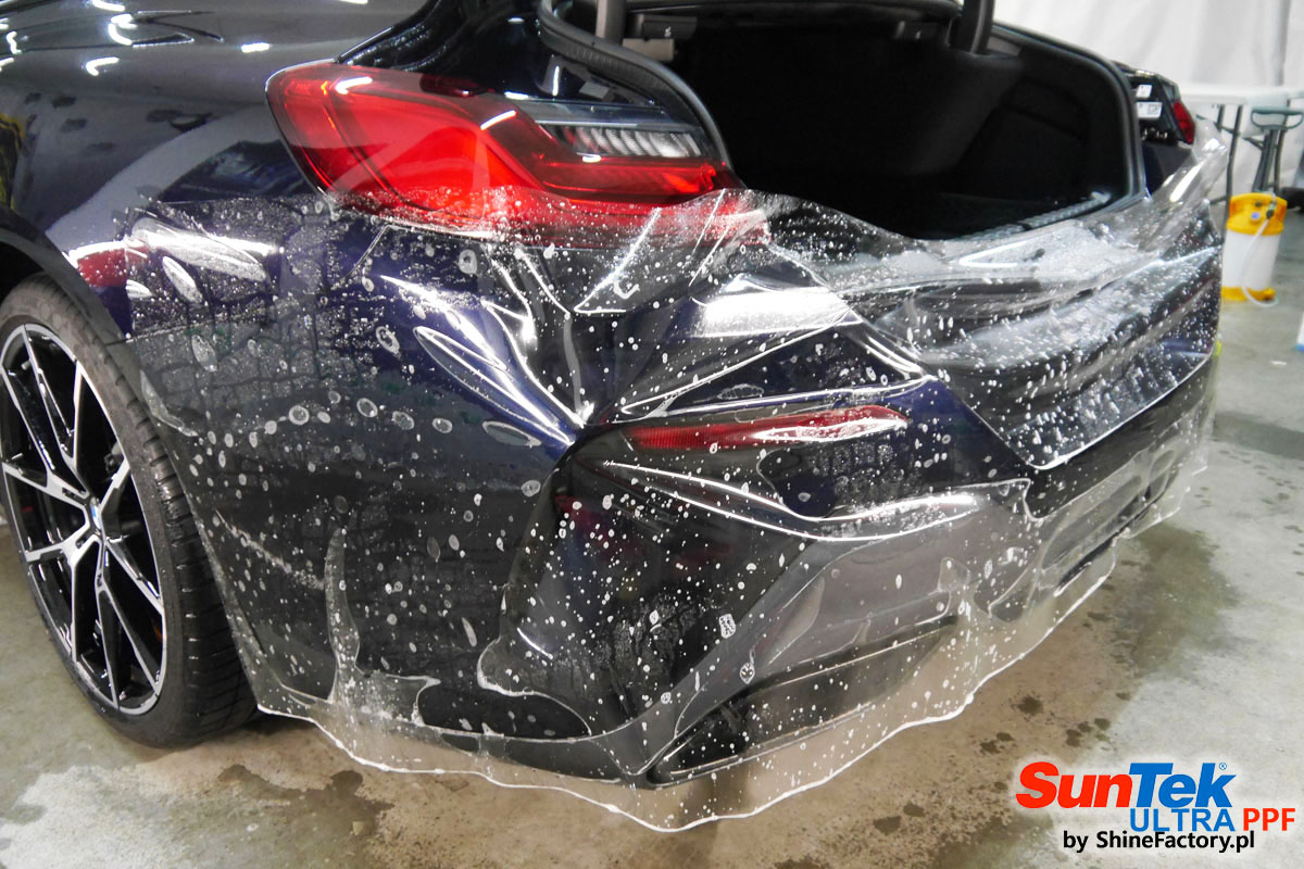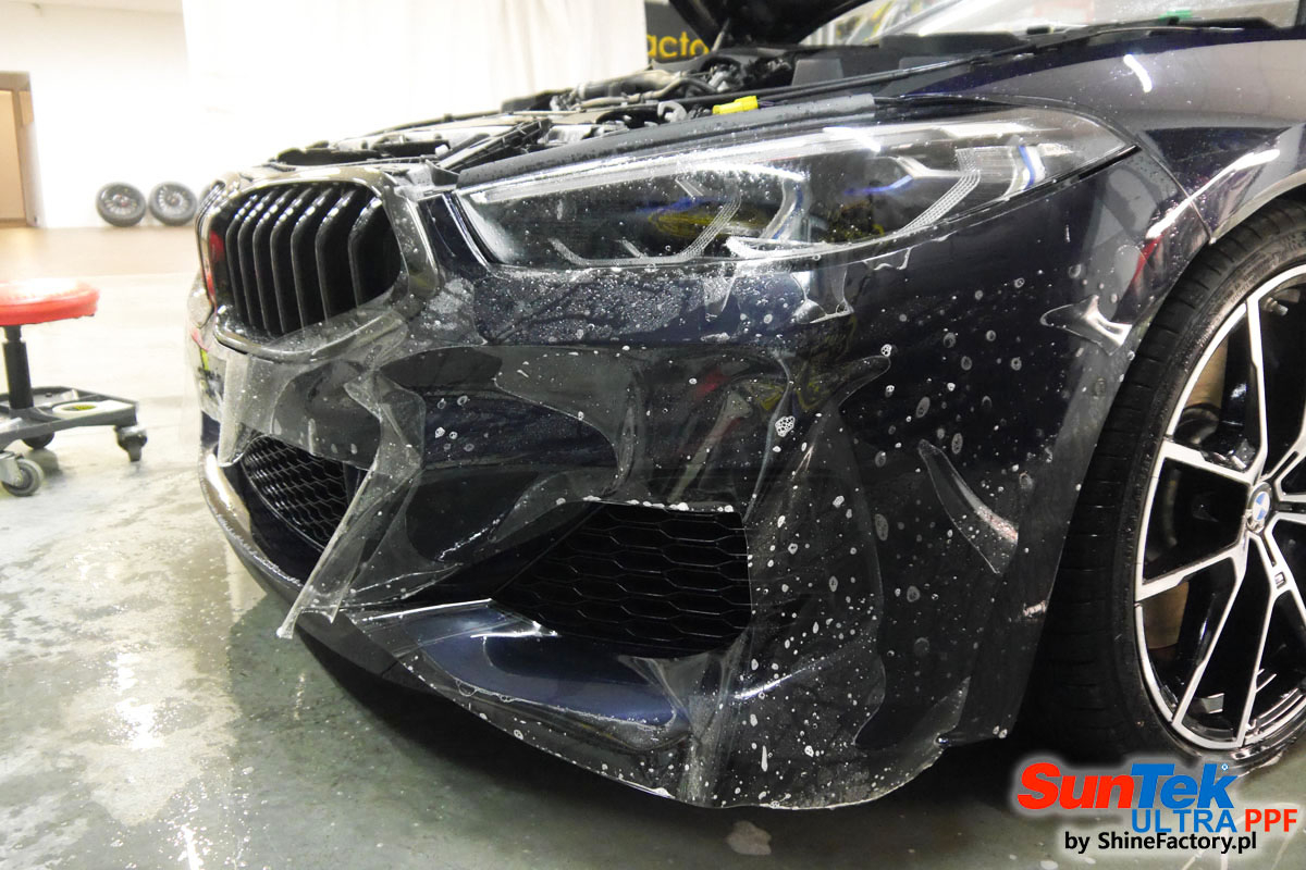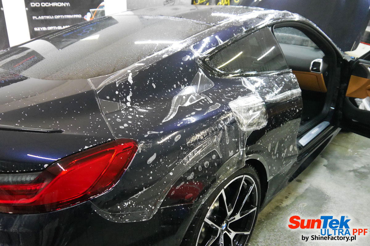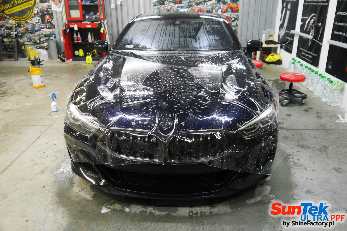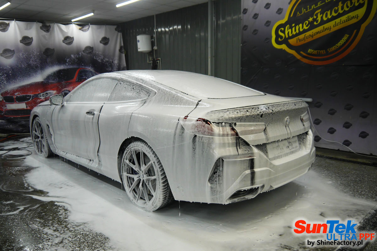 Zabezpieczenie frontów aut bezbarwnymi foliami ochronnymi staje się powoli standardem, coraz częściej także zabezpieczane w ten sposób są auta w całości co daje do tego czasu nieosiągalne perfekcyjne zabezpieczenie i efekt wizualny. Tym razem mieliśmy przyjemność zająć się BMW 8 coupe w wersji 850i, auto trafiło do nas z niewielkim przebiegiem aby zdemontować źle położone folie na przodzie w innym zakładzie oraz całe auto pokryć foliami ochronnymi. Decyzja padła oczywiście na połączanie znakomitych bezbarwnych folii ochronnych SunTek Ultra PPF z 10 letnią gwarancją oraz pakietu powłok ceramicznych. Standardowo prace zaczęliśmy od bardzo dokładnego oczyszczenia nadwozia z wszelkich naleciałości. Kolejno zajęliśmy się inspekcją lakieru i skorygowaniem oraz doprowadzeniem go do perfekcji po czasie użytkowania. Po przygotowaniu przeszliśmy do zabezpieczenia auta, najpierw aplikując bezbarwne folie ochronne. Folie zazwyczaj aplikuje się na najbardziej narażone el. auta jak przód, tym razem zdecydowaliśmy się praktycznie całe auto pokryć najlepszymi na świecie regeneracyjnymi foliami SunTek Ultra aby uzyskać 100% ochronę lakieru, który będzie całkowicie izolowany od środowiska zewnętrznego i nic nie będzie wstanie go uszkodzić. Po aplikacji folii przeszliśmy do zabezpieczania wszelkich el. auta powłokami, zaaplikowaliśmy pakiet powłok na całe auto, folie, szyby (Gtechniq G1), felgi (DLUX), elementy nielakierowane, a także całe wnętrze wraz z zaimpregnowaniem delikatnych skór. Po kilkudziesięciu godzinach pracy BMW nabrało perfekcyjnego wyglądu, połysku oraz co najważniejsze najmocniejszej praktycznie pancernej ochrony na lata. Zapraszamy do szerokiej fotorelacji!