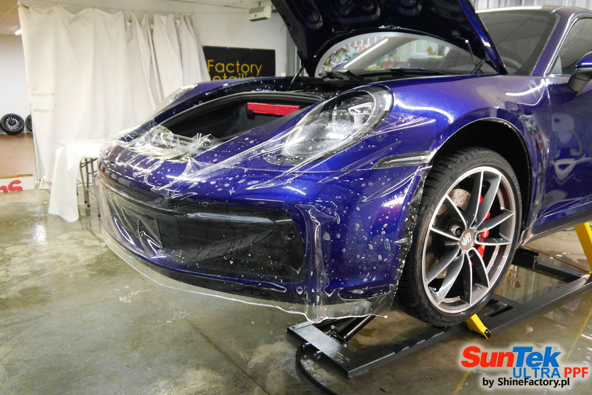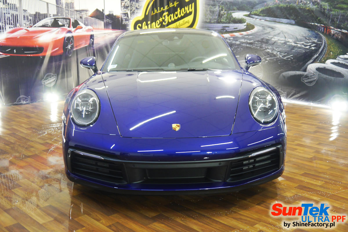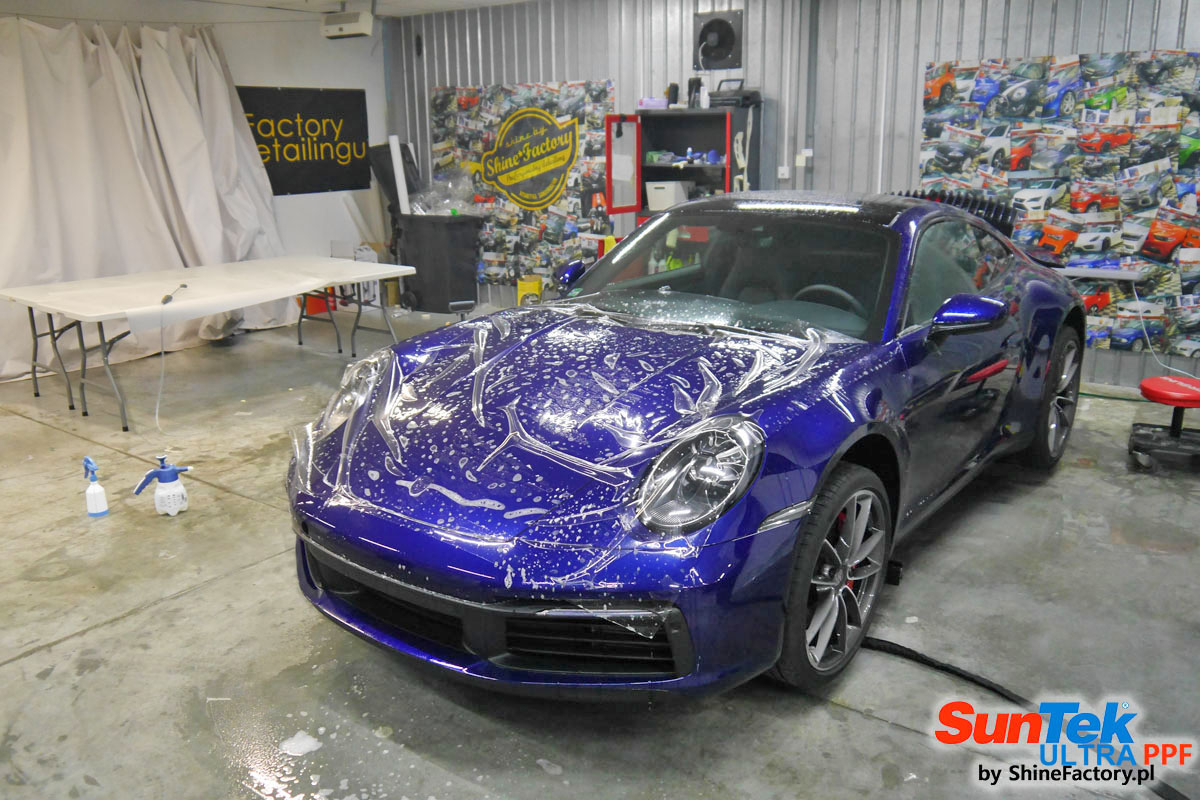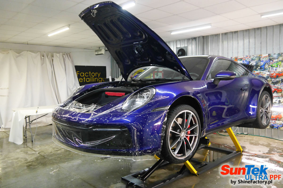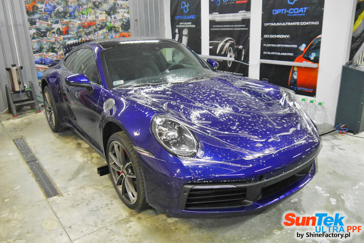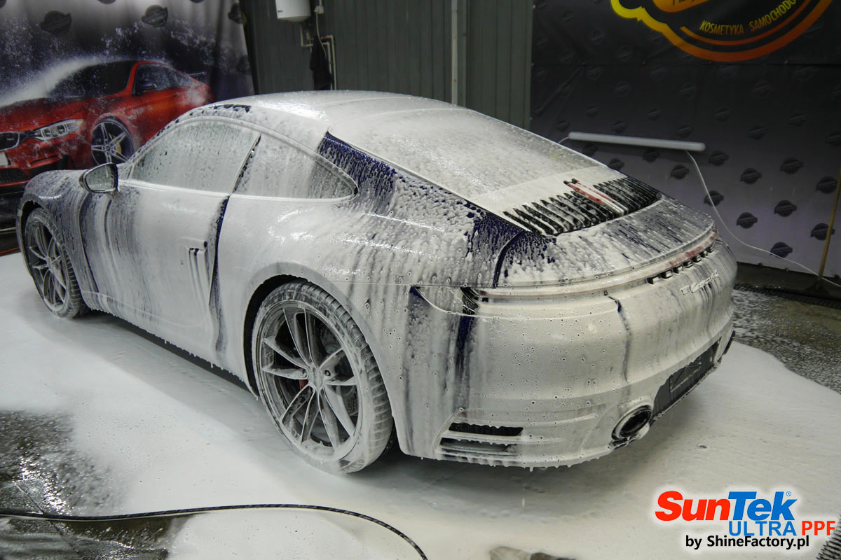 Zabezpieczenie frontów aut bezbarwnymi foliami ochronnymi staje się powoli standardem, coraz częściej także zabezpieczane w ten sposób są auta w całości co daje do tego czasu nieosiągalne perfekcyjne zabezpieczenie i efekt wizualny. Tym razem mieliśmy przyjemność zająć się najnowszym Porsche 911, auto trafiło do nas kiedy to po kilkuset km przebiegu właściciel zauważył jak strasznie delikatny jest lakier jego auta.. Decyzja wz. z zabezpieczeniem padła oczywiście na połączanie znakomitych bezbarwnych folii ochronnych SunTek Ultra PPF z 10 letnią gwarancją oraz pakietu powłok ceramicznych. Standardowo prace zaczęliśmy od bardzo dokładnego oczyszczenia nadwozia z wszelkich naleciałości. Kolejno zajęliśmy się inspekcją lakieru i skorygowaniem oraz doprowadzeniem go do możliwej perfekcji po czasie użytkowania. Po przygotowaniu przeszliśmy do zabezpieczenia auta, najpierw aplikując bezbarwne folie ochronne. Folie zazwyczaj aplikuje się na najbardziej narażone el. auta jak przód, tym razem zdecydowaliśmy się praktycznie całe auto pokryć najlepszymi na świecie regeneracyjnymi foliami SunTek Ultra aby uzyskać 100% ochronę lakieru, który będzie całkowicie izolowany od środowiska zewnętrznego i nic nie będzie wstanie go uszkodzić. Po aplikacji folii przeszliśmy do zabezpieczania wszelkich el. auta powłokami, zaaplikowaliśmy pakiet powłok na całe auto, folie, szyby (Gtechniq G1), felgi (DLUX), elementy nielakierowane, a także całe wnętrze wraz z zaimpregnowaniem delikatnych skór. Po kilkudziesięciu godzinach pracy Porsche nabrało perfekcyjnego wyglądu, połysku oraz co najważniejsze najmocniejszej praktycznie pancernej ochrony na lata. Zapraszamy do szerokiej fotorelacji!