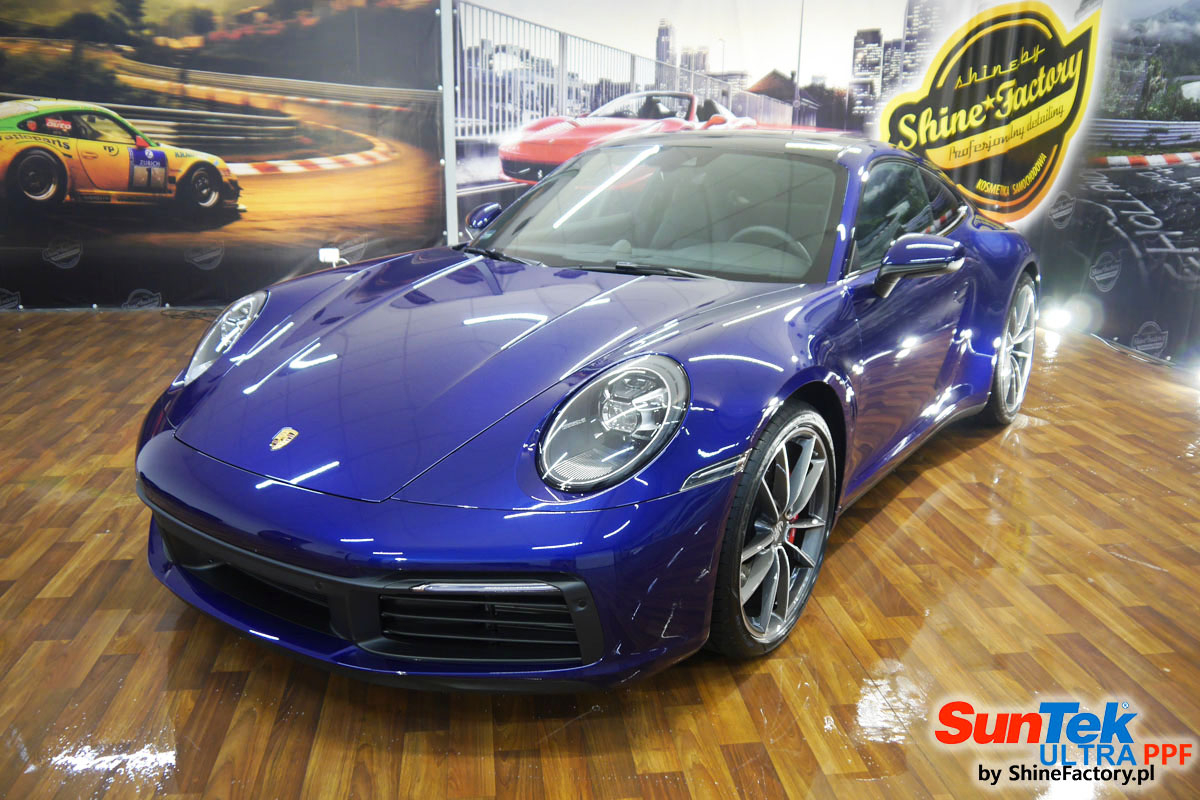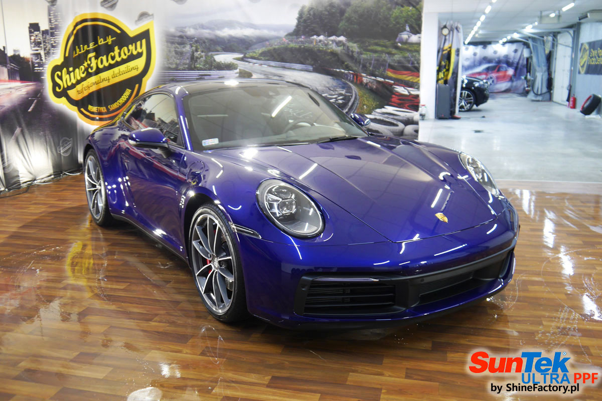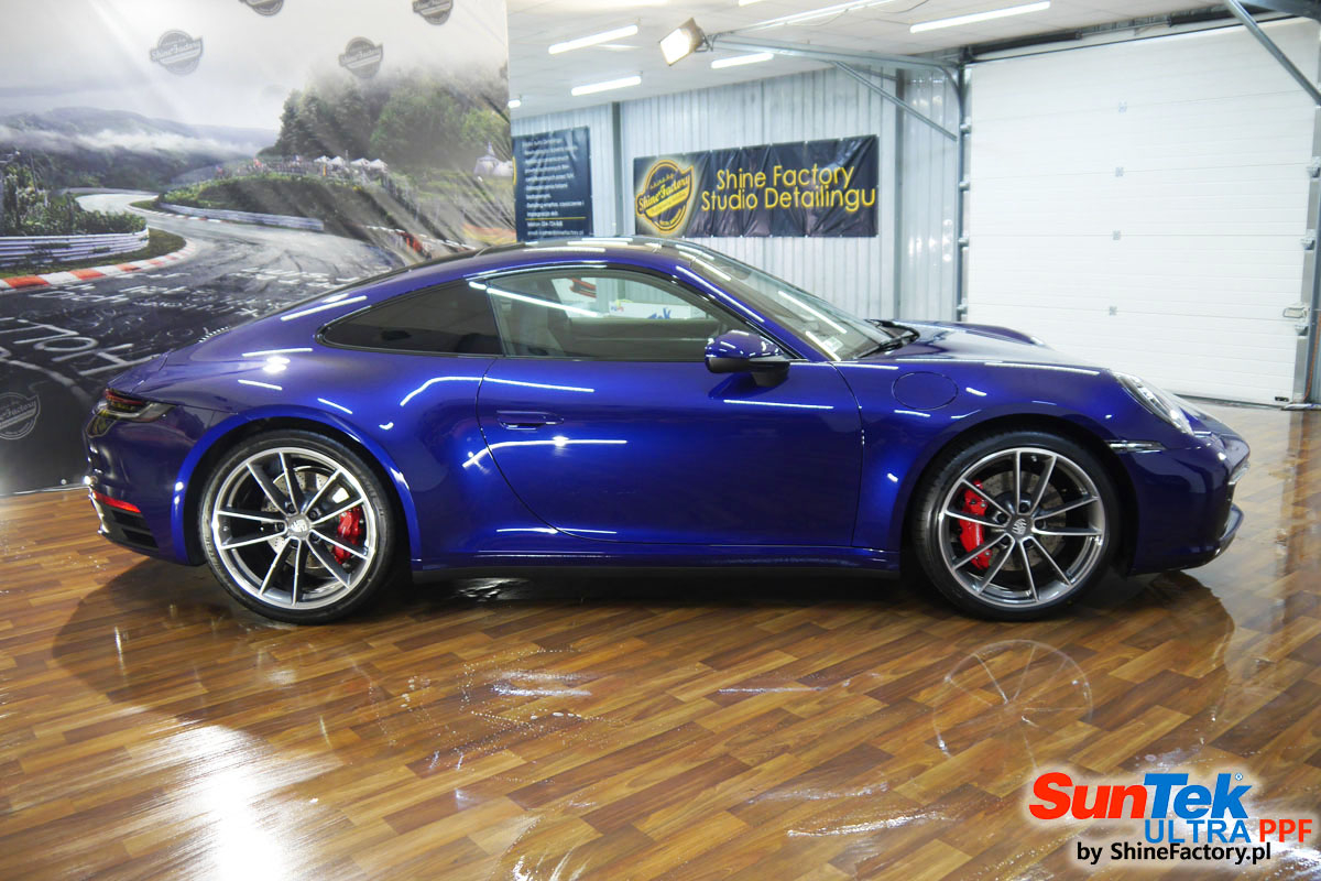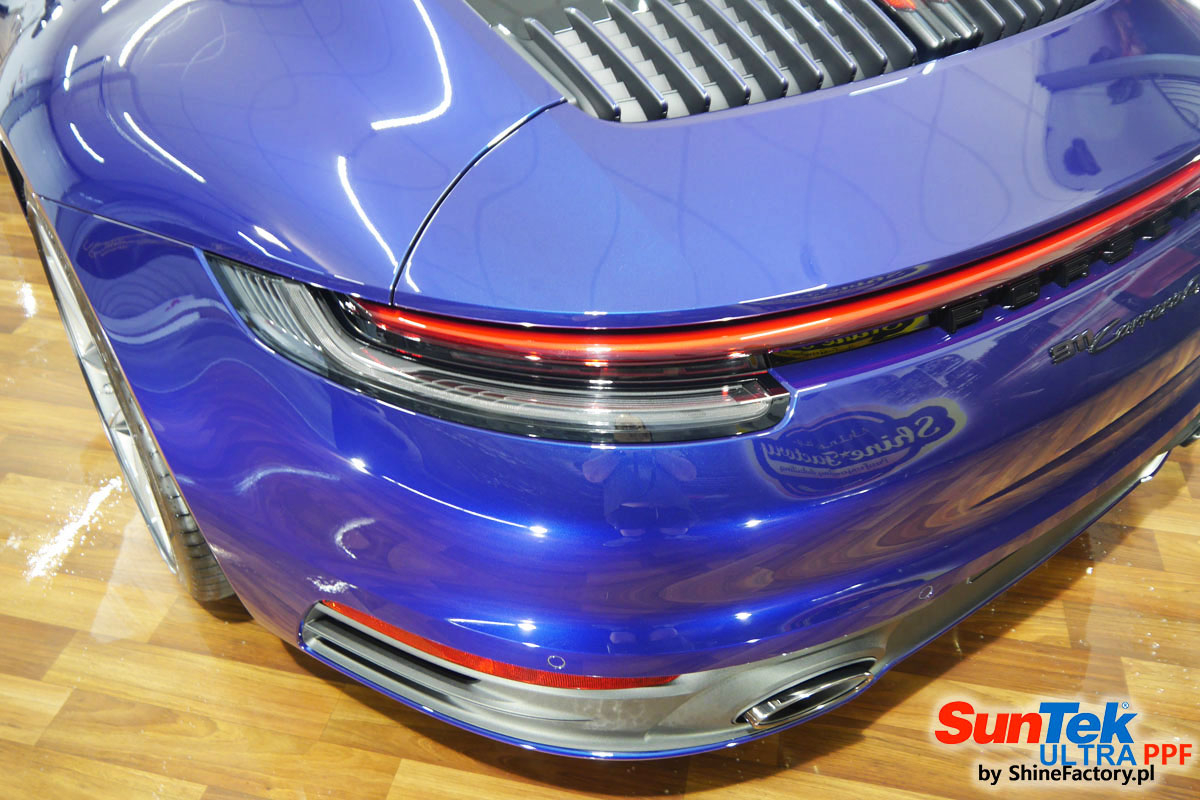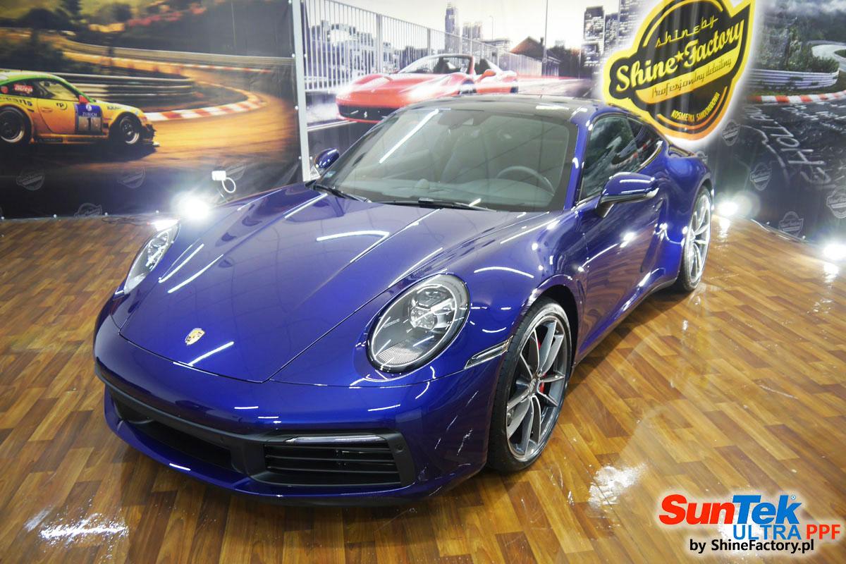 Zabezpieczenie frontów aut bezbarwnymi foliami ochronnymi staje się powoli standardem, coraz częściej także zabezpieczane w ten sposób są auta w całości co daje do tego czasu nieosiągalne perfekcyjne zabezpieczenie i efekt wizualny. Tym razem mieliśmy przyjemność zająć się najnowszym Porsche 911, auto trafiło do nas kiedy to po kilkuset km przebiegu właściciel zauważył jak strasznie delikatny jest lakier jego auta.. Decyzja wz. z zabezpieczeniem padła oczywiście na połączanie znakomitych bezbarwnych folii ochronnych SunTek Ultra PPF z 10 letnią gwarancją oraz pakietu powłok ceramicznych. Standardowo prace zaczęliśmy od bardzo dokładnego oczyszczenia nadwozia z wszelkich naleciałości. Kolejno zajęliśmy się inspekcją lakieru i skorygowaniem oraz doprowadzeniem go do możliwej perfekcji po czasie użytkowania. Po przygotowaniu przeszliśmy do zabezpieczenia auta, najpierw aplikując bezbarwne folie ochronne. Folie zazwyczaj aplikuje się na najbardziej narażone el. auta jak przód, tym razem zdecydowaliśmy się praktycznie całe auto pokryć najlepszymi na świecie regeneracyjnymi foliami SunTek Ultra aby uzyskać 100% ochronę lakieru, który będzie całkowicie izolowany od środowiska zewnętrznego i nic nie będzie wstanie go uszkodzić. Po aplikacji folii przeszliśmy do zabezpieczania wszelkich el. auta powłokami, zaaplikowaliśmy pakiet powłok na całe auto, folie, szyby (Gtechniq G1), felgi (DLUX), elementy nielakierowane, a także całe wnętrze wraz z zaimpregnowaniem delikatnych skór. Po kilkudziesięciu godzinach pracy Porsche nabrało perfekcyjnego wyglądu, połysku oraz co najważniejsze najmocniejszej praktycznie pancernej ochrony na lata. Zapraszamy do szerokiej fotorelacji!