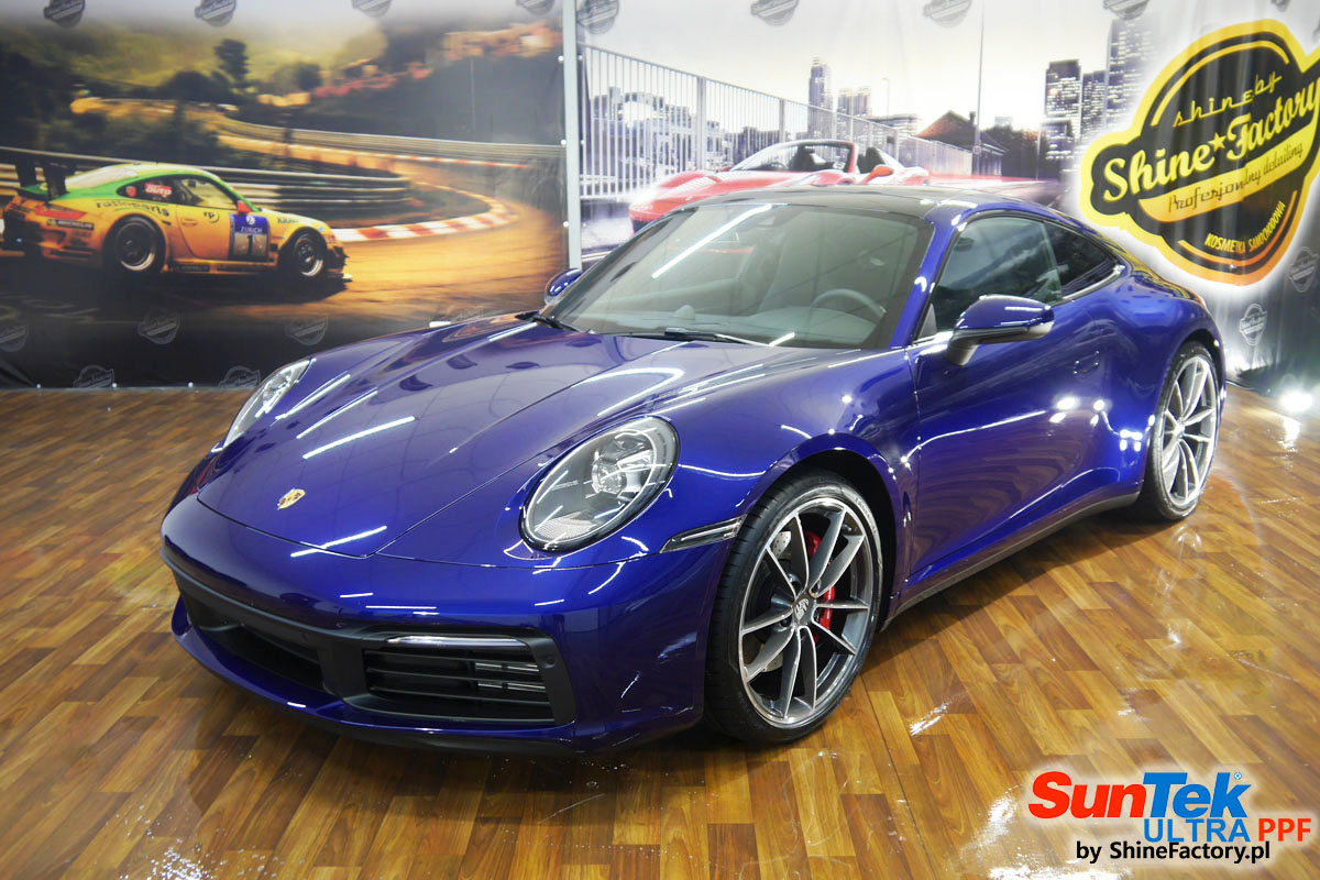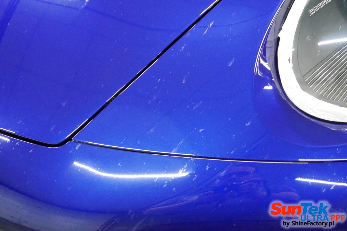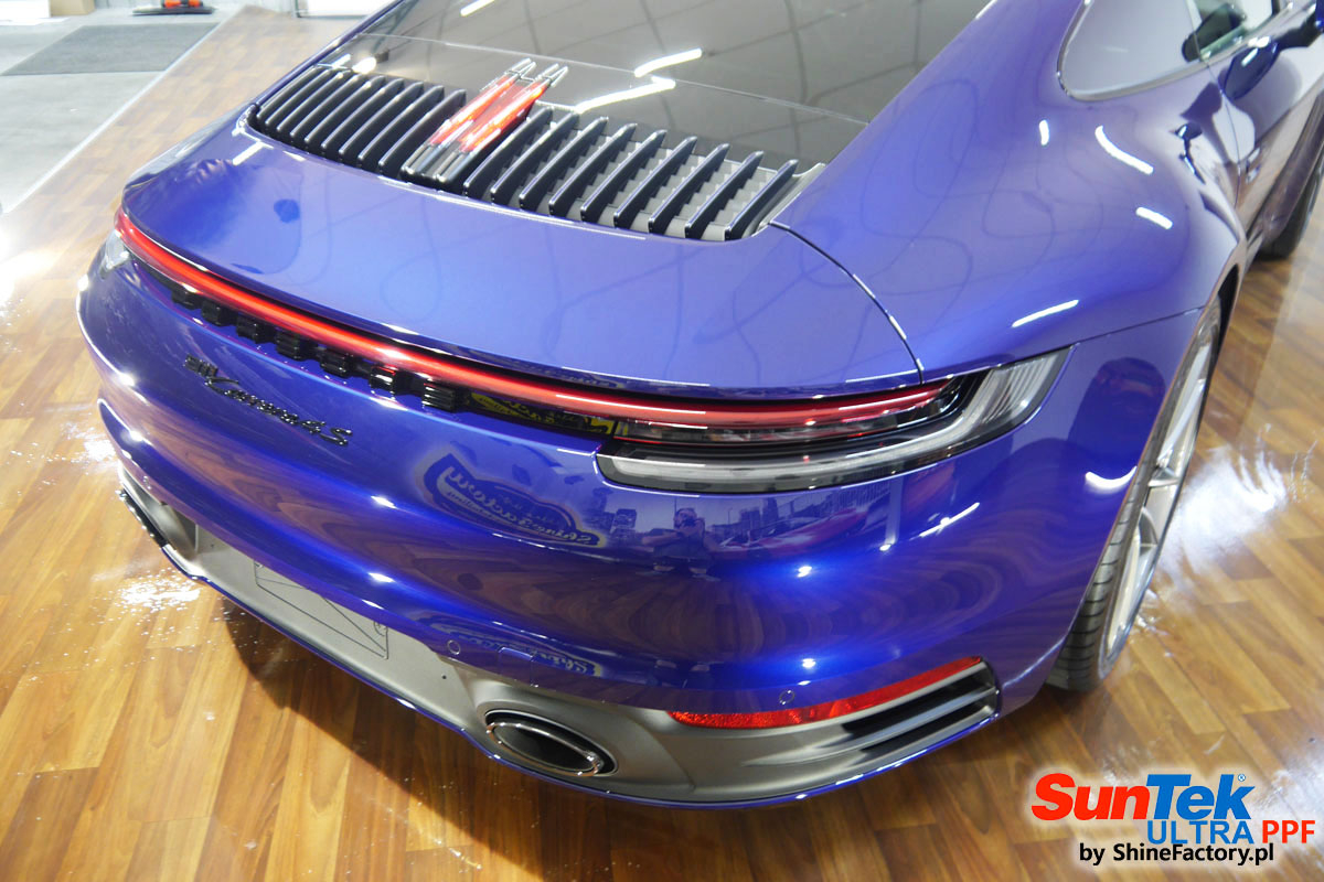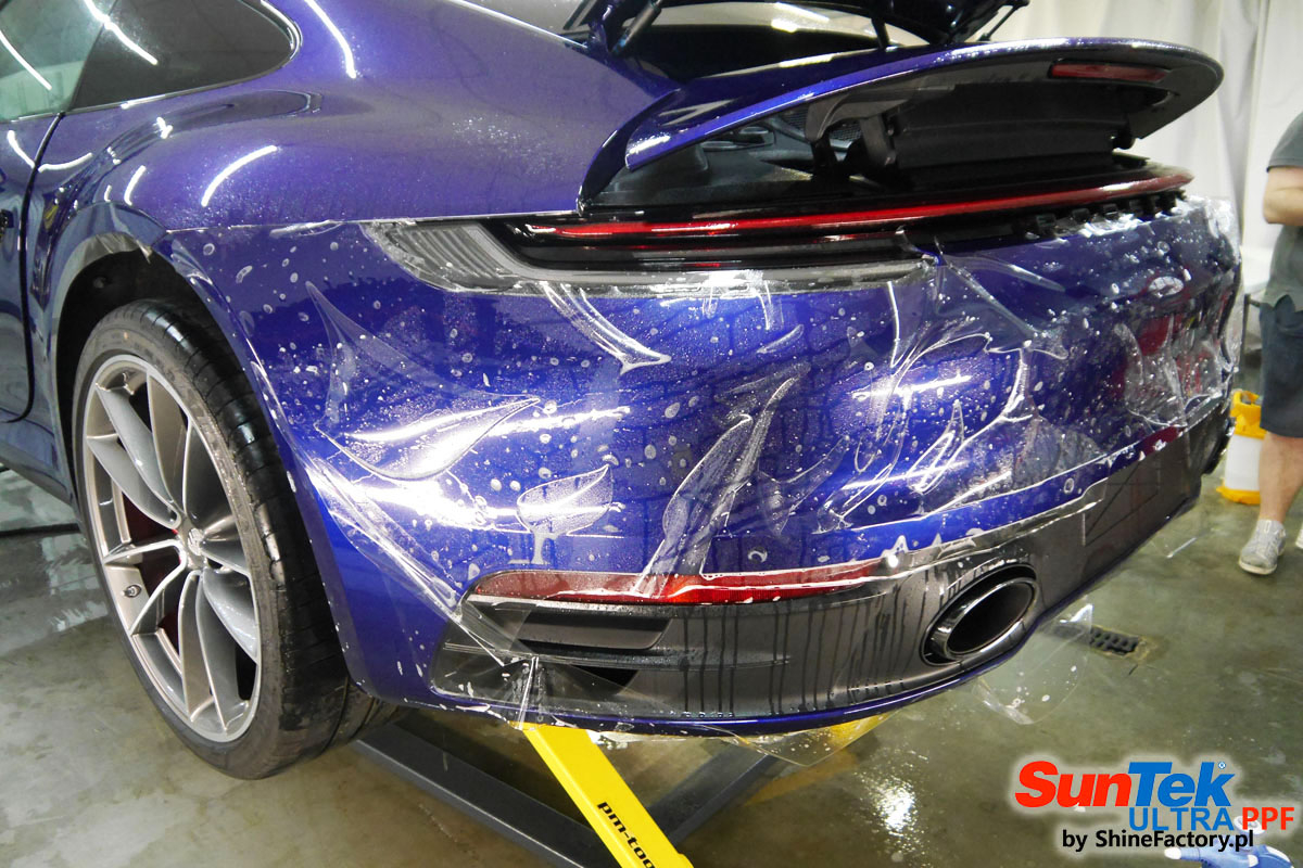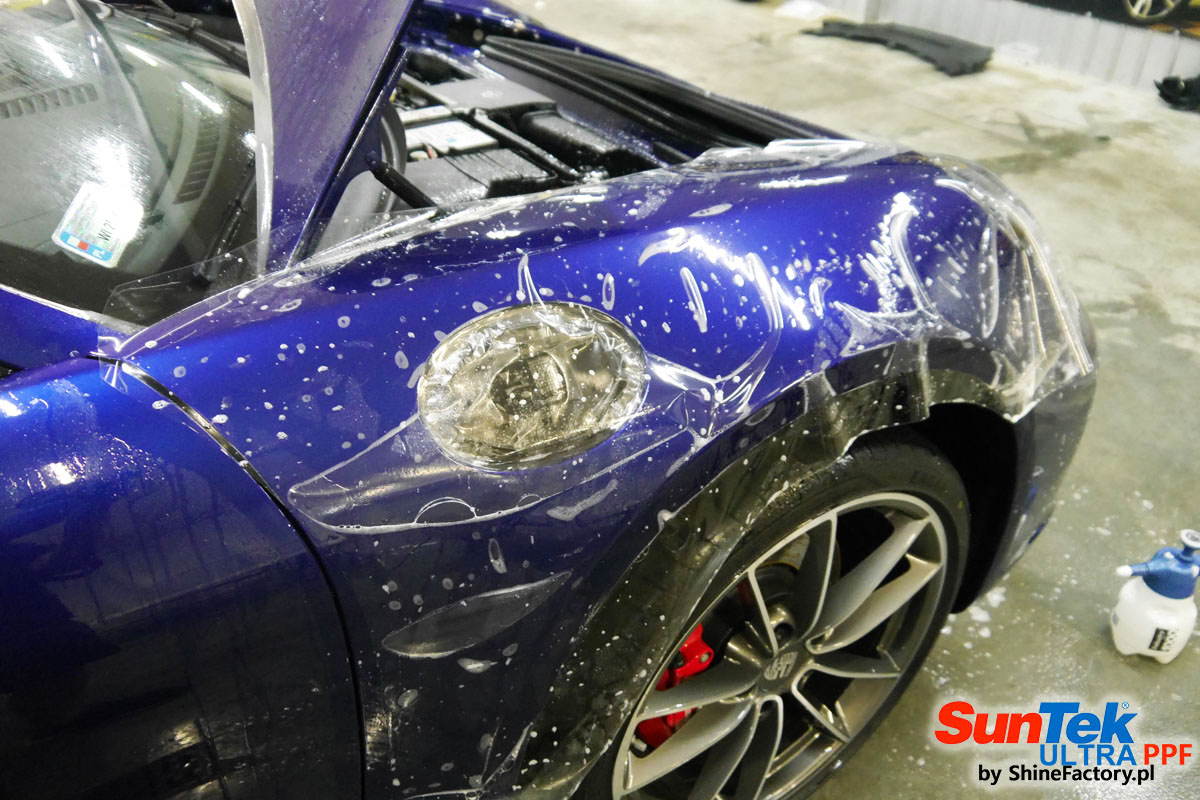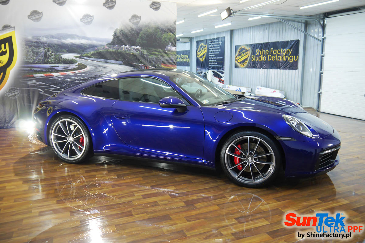 Zabezpieczenie frontów aut bezbarwnymi foliami ochronnymi staje się powoli standardem, coraz częściej także zabezpieczane w ten sposób są auta w całości co daje do tego czasu nieosiągalne perfekcyjne zabezpieczenie i efekt wizualny. Tym razem mieliśmy przyjemność zająć się najnowszym Porsche 911, auto trafiło do nas kiedy to po kilkuset km przebiegu właściciel zauważył jak strasznie delikatny jest lakier jego auta.. Decyzja wz. z zabezpieczeniem padła oczywiście na połączanie znakomitych bezbarwnych folii ochronnych SunTek Ultra PPF z 10 letnią gwarancją oraz pakietu powłok ceramicznych. Standardowo prace zaczęliśmy od bardzo dokładnego oczyszczenia nadwozia z wszelkich naleciałości. Kolejno zajęliśmy się inspekcją lakieru i skorygowaniem oraz doprowadzeniem go do możliwej perfekcji po czasie użytkowania. Po przygotowaniu przeszliśmy do zabezpieczenia auta, najpierw aplikując bezbarwne folie ochronne. Folie zazwyczaj aplikuje się na najbardziej narażone el. auta jak przód, tym razem zdecydowaliśmy się praktycznie całe auto pokryć najlepszymi na świecie regeneracyjnymi foliami SunTek Ultra aby uzyskać 100% ochronę lakieru, który będzie całkowicie izolowany od środowiska zewnętrznego i nic nie będzie wstanie go uszkodzić. Po aplikacji folii przeszliśmy do zabezpieczania wszelkich el. auta powłokami, zaaplikowaliśmy pakiet powłok na całe auto, folie, szyby (Gtechniq G1), felgi (DLUX), elementy nielakierowane, a także całe wnętrze wraz z zaimpregnowaniem delikatnych skór. Po kilkudziesięciu godzinach pracy Porsche nabrało perfekcyjnego wyglądu, połysku oraz co najważniejsze najmocniejszej praktycznie pancernej ochrony na lata. Zapraszamy do szerokiej fotorelacji!