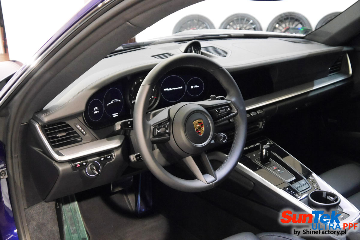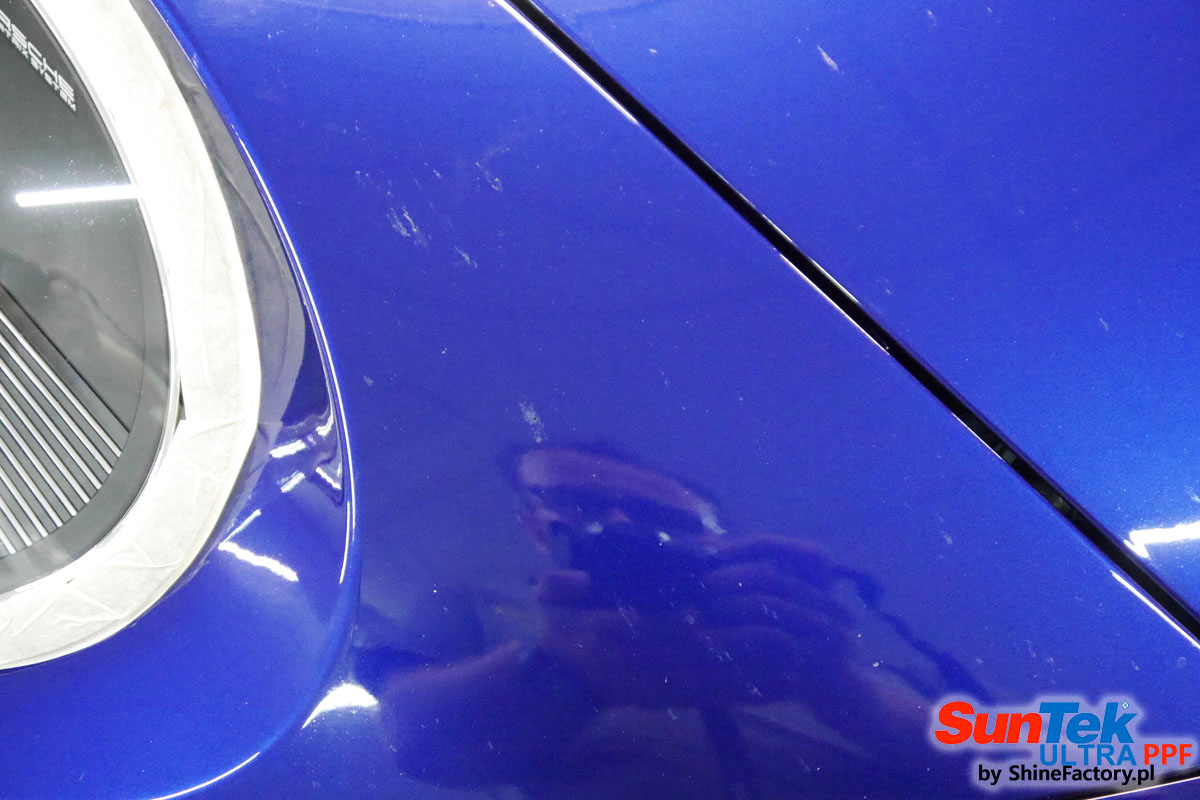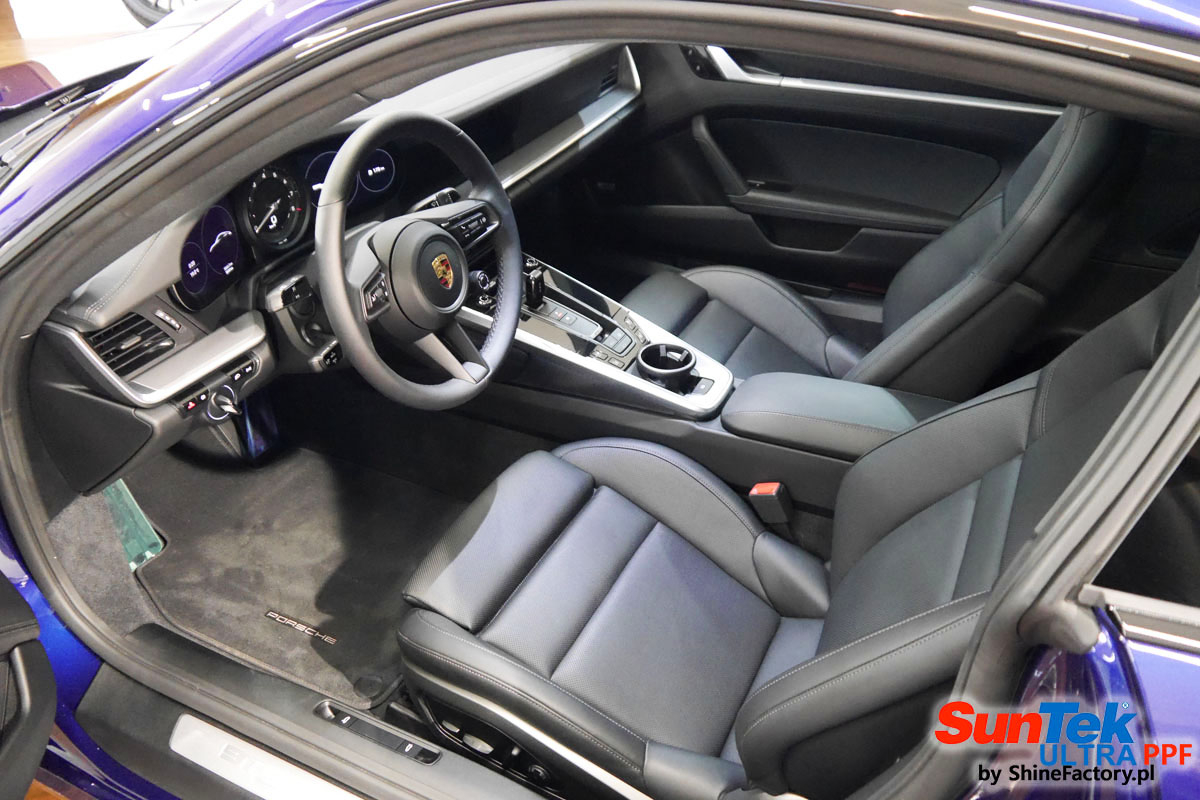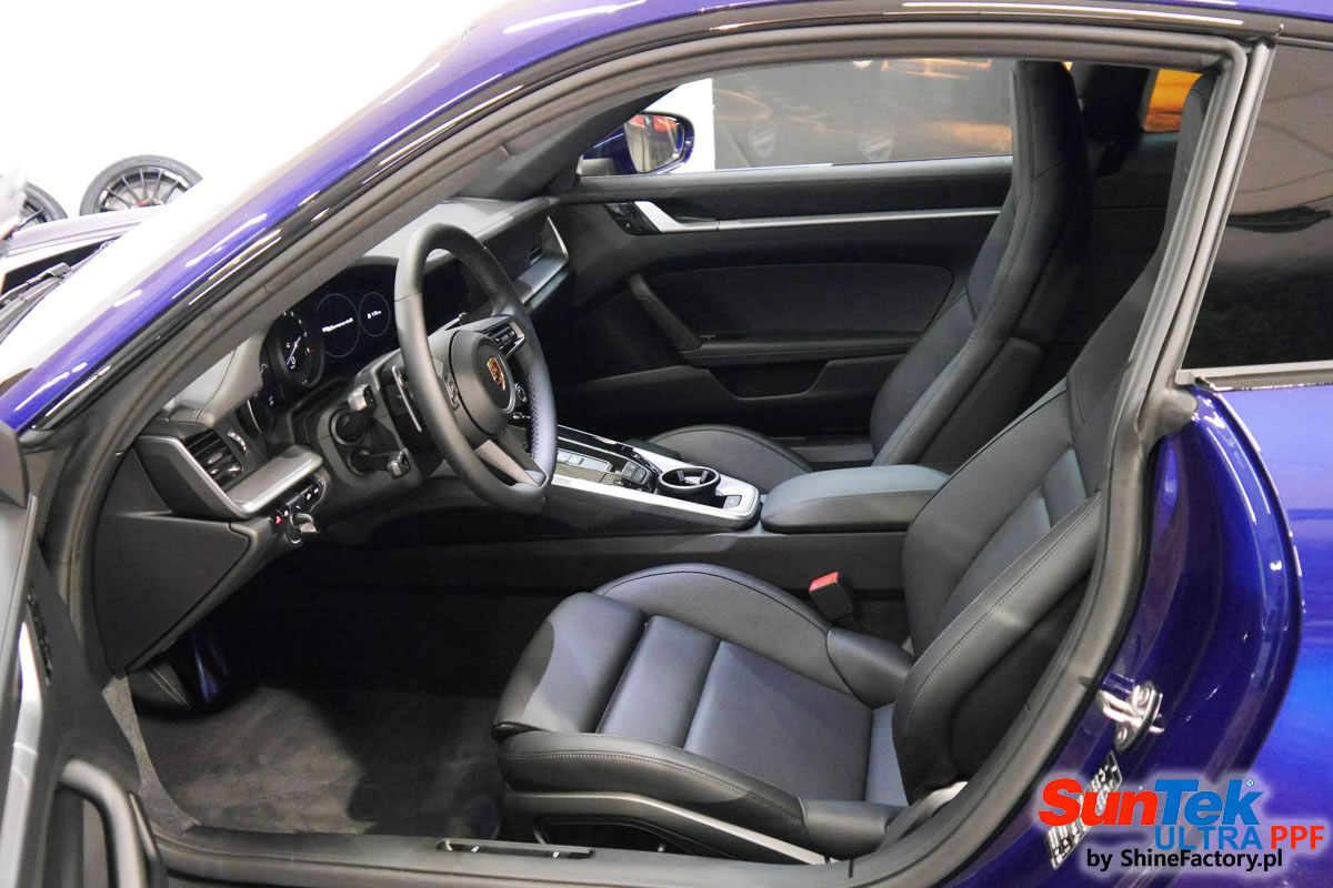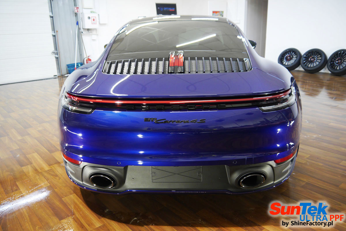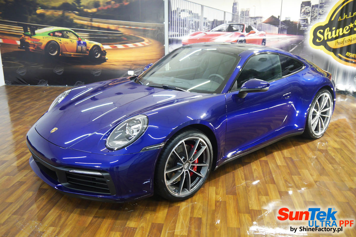 Zabezpieczenie frontów aut bezbarwnymi foliami ochronnymi staje się powoli standardem, coraz częściej także zabezpieczane w ten sposób są auta w całości co daje do tego czasu nieosiągalne perfekcyjne zabezpieczenie i efekt wizualny. Tym razem mieliśmy przyjemność zająć się najnowszym Porsche 911, auto trafiło do nas kiedy to po kilkuset km przebiegu właściciel zauważył jak strasznie delikatny jest lakier jego auta.. Decyzja wz. z zabezpieczeniem padła oczywiście na połączanie znakomitych bezbarwnych folii ochronnych SunTek Ultra PPF z 10 letnią gwarancją oraz pakietu powłok ceramicznych. Standardowo prace zaczęliśmy od bardzo dokładnego oczyszczenia nadwozia z wszelkich naleciałości. Kolejno zajęliśmy się inspekcją lakieru i skorygowaniem oraz doprowadzeniem go do możliwej perfekcji po czasie użytkowania. Po przygotowaniu przeszliśmy do zabezpieczenia auta, najpierw aplikując bezbarwne folie ochronne. Folie zazwyczaj aplikuje się na najbardziej narażone el. auta jak przód, tym razem zdecydowaliśmy się praktycznie całe auto pokryć najlepszymi na świecie regeneracyjnymi foliami SunTek Ultra aby uzyskać 100% ochronę lakieru, który będzie całkowicie izolowany od środowiska zewnętrznego i nic nie będzie wstanie go uszkodzić. Po aplikacji folii przeszliśmy do zabezpieczania wszelkich el. auta powłokami, zaaplikowaliśmy pakiet powłok na całe auto, folie, szyby (Gtechniq G1), felgi (DLUX), elementy nielakierowane, a także całe wnętrze wraz z zaimpregnowaniem delikatnych skór. Po kilkudziesięciu godzinach pracy Porsche nabrało perfekcyjnego wyglądu, połysku oraz co najważniejsze najmocniejszej praktycznie pancernej ochrony na lata. Zapraszamy do szerokiej fotorelacji!