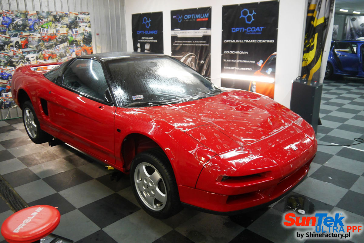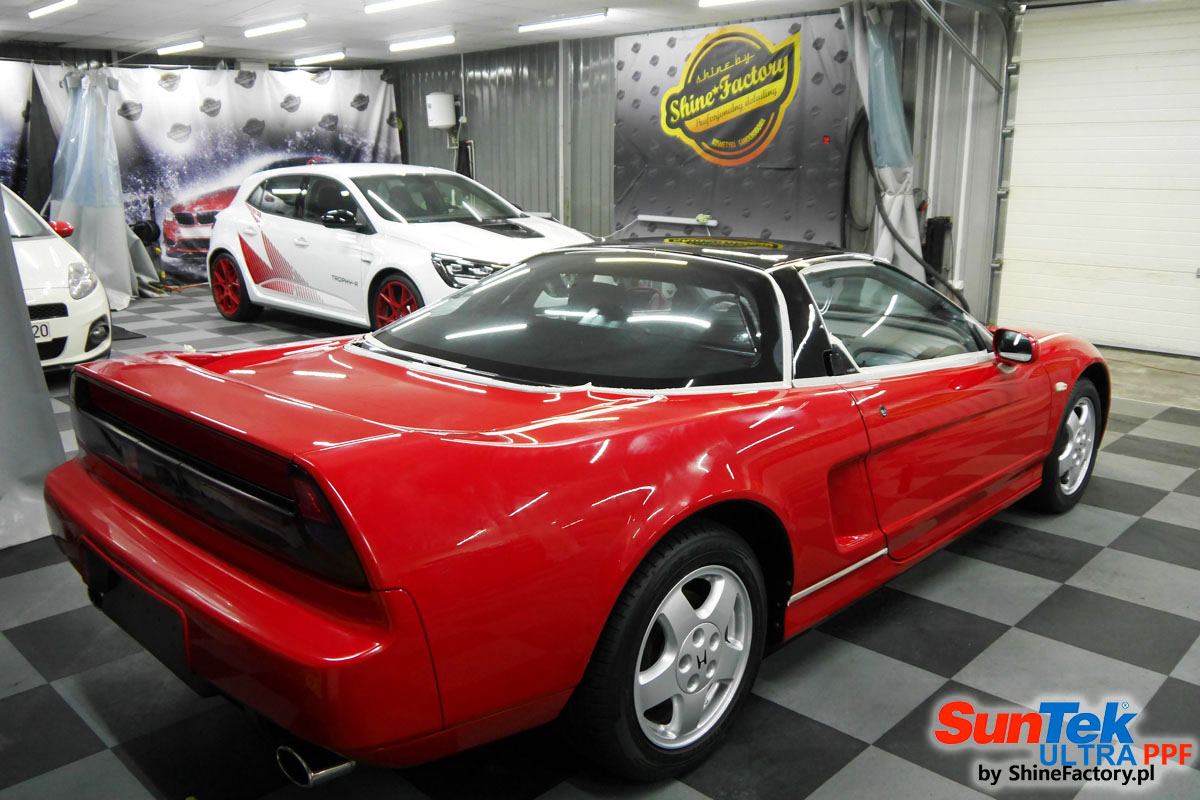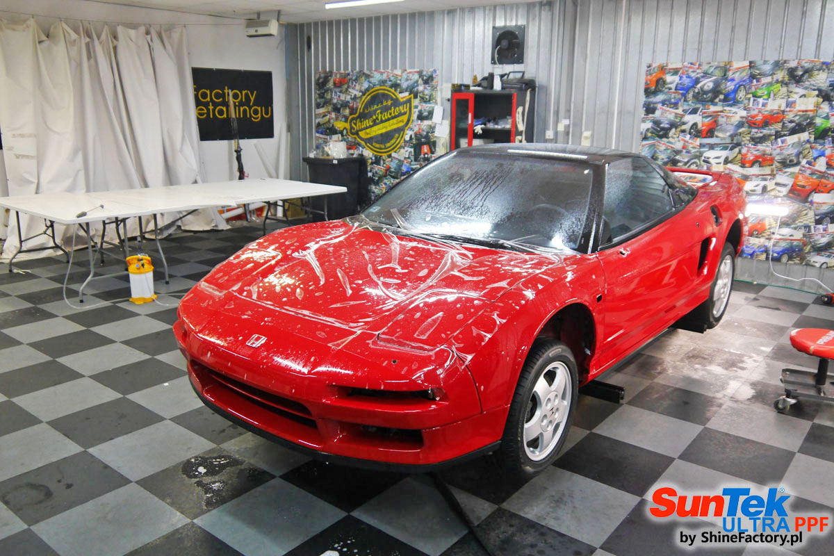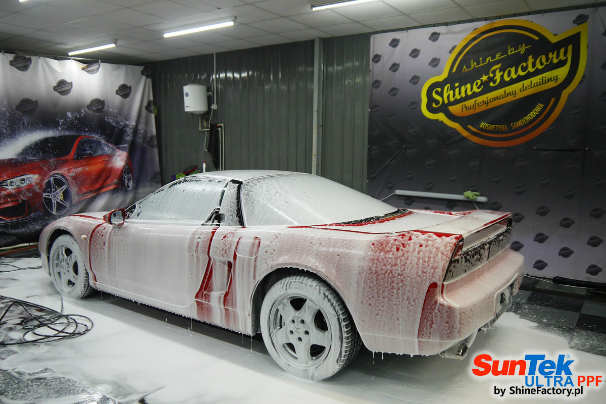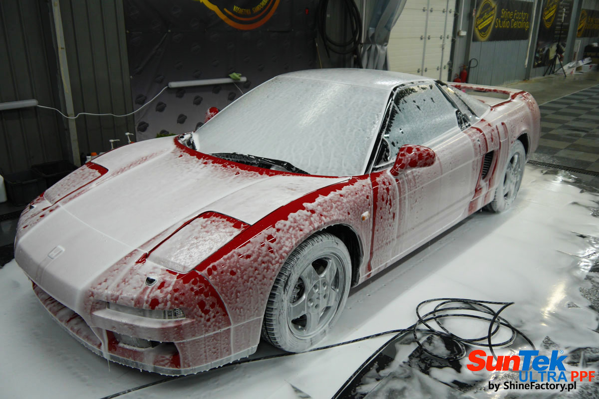 Zabezpieczenie frontów aut bezbarwnymi foliami ochronnymi staje się powoli standardem, coraz częściej także zabezpieczane w ten sposób są auta w całości co daje do tego czasu nieosiągalne perfekcyjne zabezpieczenie i efekt wizualny. Tym razem mieliśmy wyjątkową przyjemność zająć się niesamowitym autem jakim jest Honda NSX, auto trafiło do nas w perfekcyjnym stanie jak na swój wiek. Właściciel poprosił o perfekcyjne zabezpieczenie lakieru auta. Decyzja wz. z zabezpieczeniem padła oczywiście na połączanie znakomitych bezbarwnych folii ochronnych SunTek Ultra PPF z 10 letnią gwarancją oraz pakietu powłok ceramicznych. Standardowo prace zaczęliśmy od bardzo dokładnego oczyszczenia nadwozia z wszelkich naleciałości. Kolejno zajęliśmy się inspekcją lakieru i skorygowaniem oraz doprowadzeniem go do możliwej perfekcji z defektów posalonowych / potransportowych. Po przygotowaniu przeszliśmy do zabezpieczenia auta, najpierw aplikując bezbarwne folie ochronne. Folie zazwyczaj aplikuje się na najbardziej narażone el. auta jak przód, tym razem zdecydowaliśmy się praktycznie całe auto pokryć najlepszymi na świecie regeneracyjnymi foliami SunTek Ultra aby uzyskać 100% ochronę lakieru, który będzie całkowicie izolowany od środowiska zewnętrznego i nic nie będzie wstanie go uszkodzić. Po aplikacji folii przeszliśmy do zabezpieczania wszelkich el. auta powłokami, zaaplikowaliśmy pakiet powłok na całe auto, folie, szyby (Gtechniq G1), felgi (DLUX), elementy nielakierowane, a także całe wnętrze wraz z zaimpregnowaniem skór. Po kilkudziesięciu godzinach pracy Honda nabrała perfekcyjnego wyglądu, połysku oraz co najważniejsze najmocniejszej praktycznie pancernej ochrony na lata. Zapraszamy do szerokiej fotorelacji!