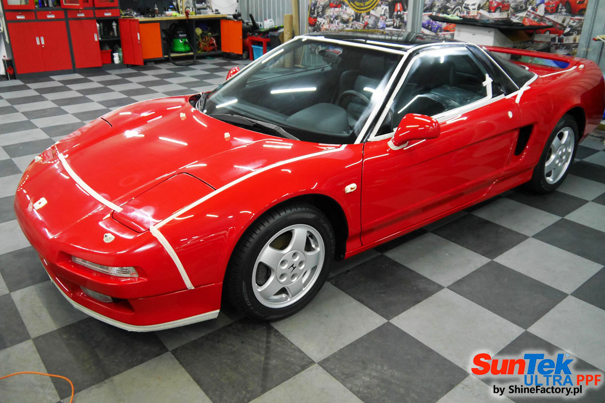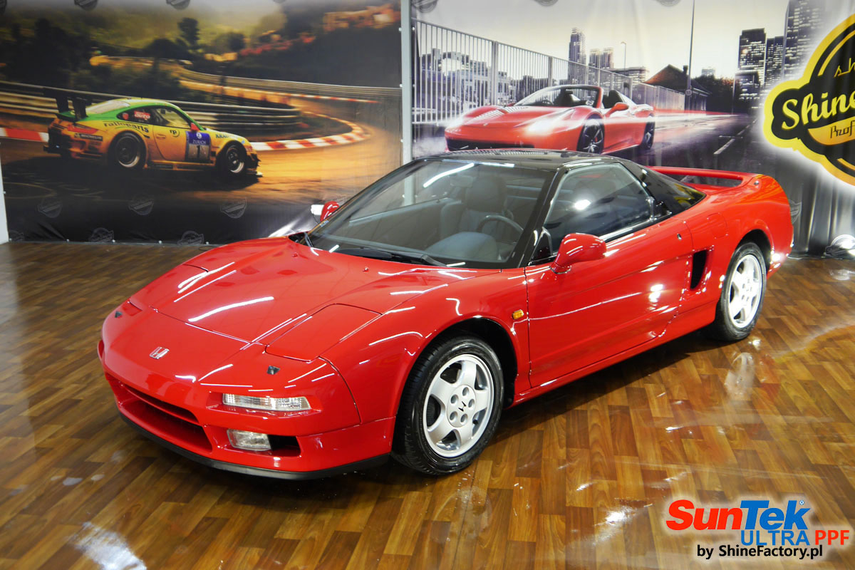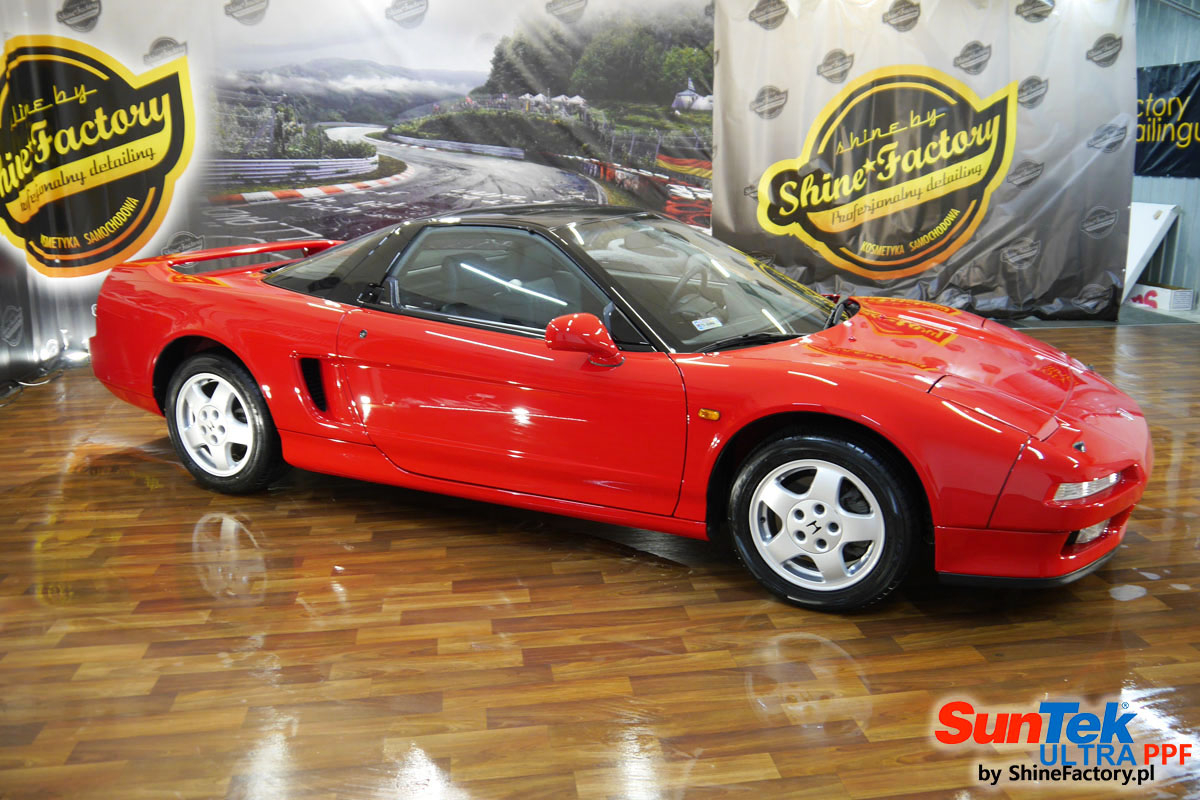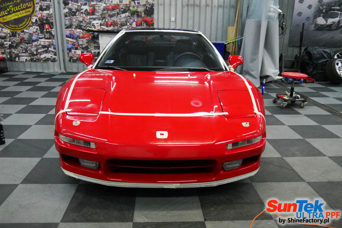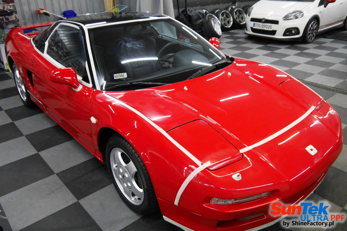 Zabezpieczenie frontów aut bezbarwnymi foliami ochronnymi staje się powoli standardem, coraz częściej także zabezpieczane w ten sposób są auta w całości co daje do tego czasu nieosiągalne perfekcyjne zabezpieczenie i efekt wizualny. Tym razem mieliśmy wyjątkową przyjemność zająć się niesamowitym autem jakim jest Honda NSX, auto trafiło do nas w perfekcyjnym stanie jak na swój wiek. Właściciel poprosił o perfekcyjne zabezpieczenie lakieru auta. Decyzja wz. z zabezpieczeniem padła oczywiście na połączanie znakomitych bezbarwnych folii ochronnych SunTek Ultra PPF z 10 letnią gwarancją oraz pakietu powłok ceramicznych. Standardowo prace zaczęliśmy od bardzo dokładnego oczyszczenia nadwozia z wszelkich naleciałości. Kolejno zajęliśmy się inspekcją lakieru i skorygowaniem oraz doprowadzeniem go do możliwej perfekcji z defektów posalonowych / potransportowych. Po przygotowaniu przeszliśmy do zabezpieczenia auta, najpierw aplikując bezbarwne folie ochronne. Folie zazwyczaj aplikuje się na najbardziej narażone el. auta jak przód, tym razem zdecydowaliśmy się praktycznie całe auto pokryć najlepszymi na świecie regeneracyjnymi foliami SunTek Ultra aby uzyskać 100% ochronę lakieru, który będzie całkowicie izolowany od środowiska zewnętrznego i nic nie będzie wstanie go uszkodzić. Po aplikacji folii przeszliśmy do zabezpieczania wszelkich el. auta powłokami, zaaplikowaliśmy pakiet powłok na całe auto, folie, szyby (Gtechniq G1), felgi (DLUX), elementy nielakierowane, a także całe wnętrze wraz z zaimpregnowaniem skór. Po kilkudziesięciu godzinach pracy Honda nabrała perfekcyjnego wyglądu, połysku oraz co najważniejsze najmocniejszej praktycznie pancernej ochrony na lata. Zapraszamy do szerokiej fotorelacji!