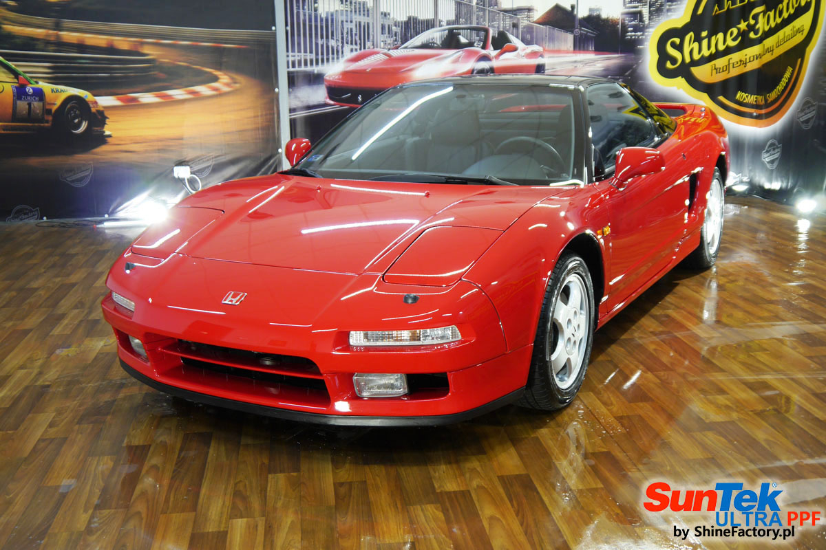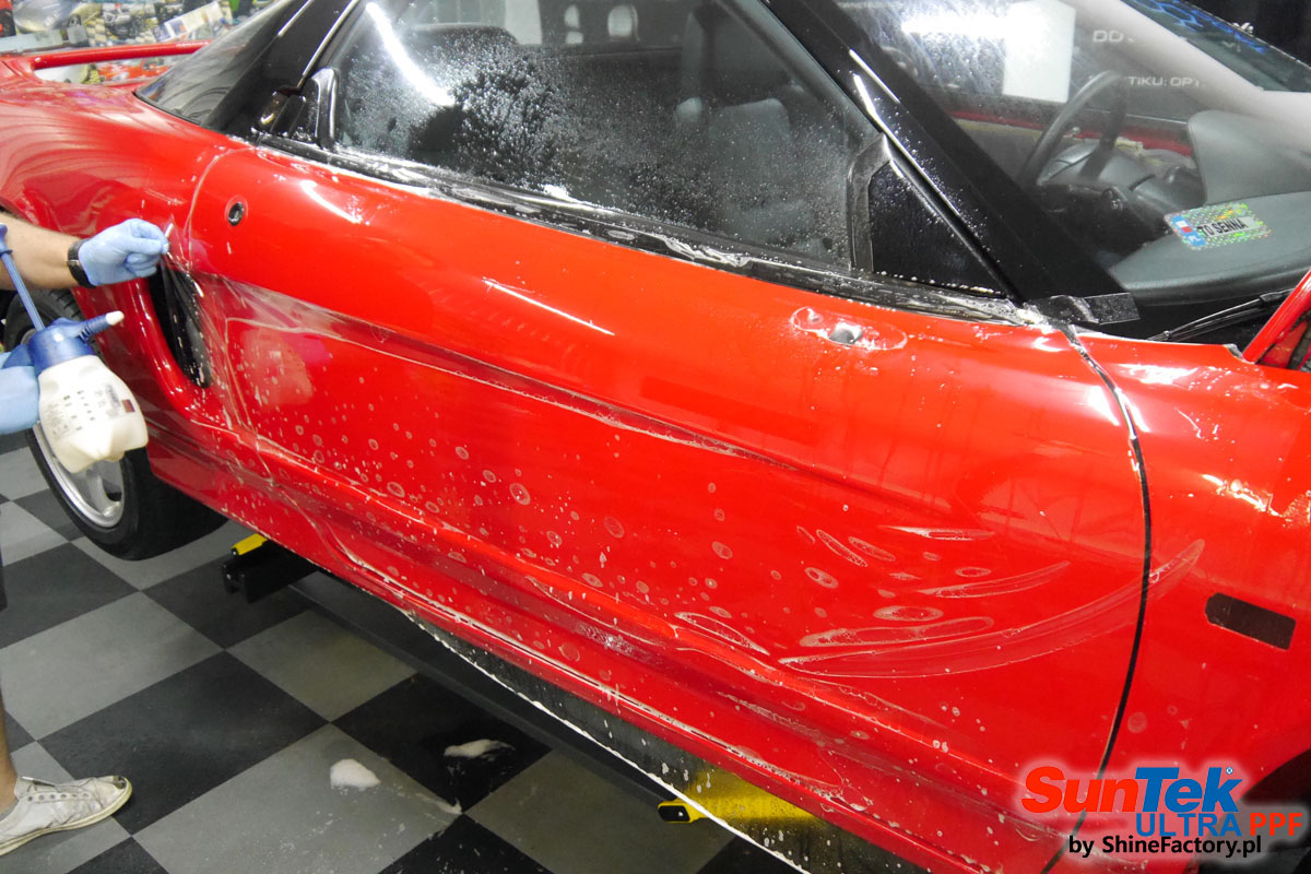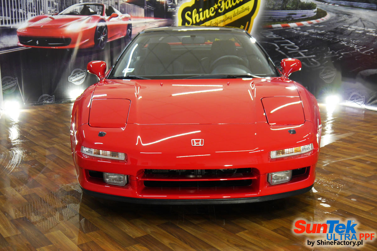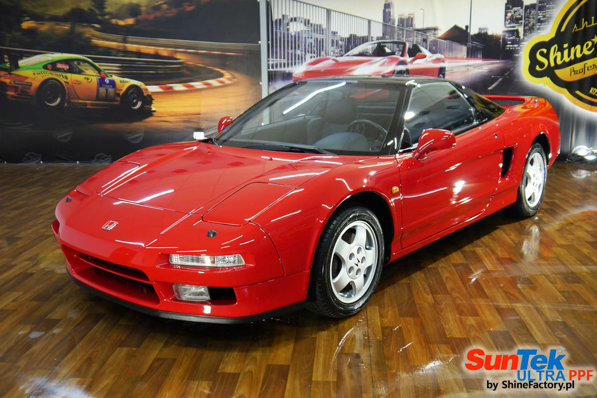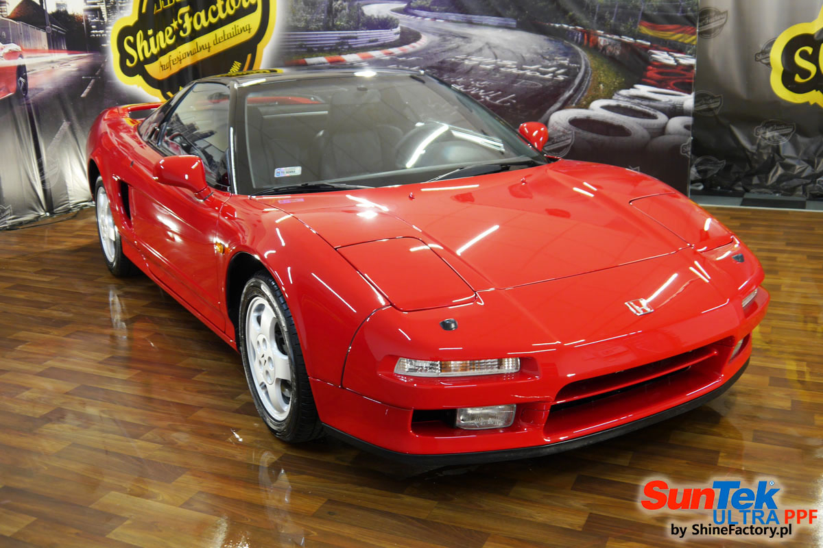 Zabezpieczenie frontów aut bezbarwnymi foliami ochronnymi staje się powoli standardem, coraz częściej także zabezpieczane w ten sposób są auta w całości co daje do tego czasu nieosiągalne perfekcyjne zabezpieczenie i efekt wizualny. Tym razem mieliśmy wyjątkową przyjemność zająć się niesamowitym autem jakim jest Honda NSX, auto trafiło do nas w perfekcyjnym stanie jak na swój wiek. Właściciel poprosił o perfekcyjne zabezpieczenie lakieru auta. Decyzja wz. z zabezpieczeniem padła oczywiście na połączanie znakomitych bezbarwnych folii ochronnych SunTek Ultra PPF z 10 letnią gwarancją oraz pakietu powłok ceramicznych. Standardowo prace zaczęliśmy od bardzo dokładnego oczyszczenia nadwozia z wszelkich naleciałości. Kolejno zajęliśmy się inspekcją lakieru i skorygowaniem oraz doprowadzeniem go do możliwej perfekcji z defektów posalonowych / potransportowych. Po przygotowaniu przeszliśmy do zabezpieczenia auta, najpierw aplikując bezbarwne folie ochronne. Folie zazwyczaj aplikuje się na najbardziej narażone el. auta jak przód, tym razem zdecydowaliśmy się praktycznie całe auto pokryć najlepszymi na świecie regeneracyjnymi foliami SunTek Ultra aby uzyskać 100% ochronę lakieru, który będzie całkowicie izolowany od środowiska zewnętrznego i nic nie będzie wstanie go uszkodzić. Po aplikacji folii przeszliśmy do zabezpieczania wszelkich el. auta powłokami, zaaplikowaliśmy pakiet powłok na całe auto, folie, szyby (Gtechniq G1), felgi (DLUX), elementy nielakierowane, a także całe wnętrze wraz z zaimpregnowaniem skór. Po kilkudziesięciu godzinach pracy Honda nabrała perfekcyjnego wyglądu, połysku oraz co najważniejsze najmocniejszej praktycznie pancernej ochrony na lata. Zapraszamy do szerokiej fotorelacji!