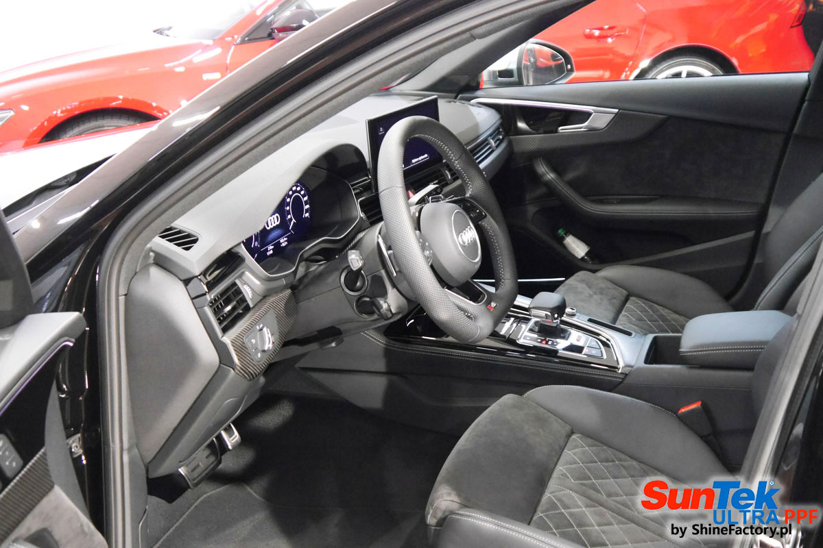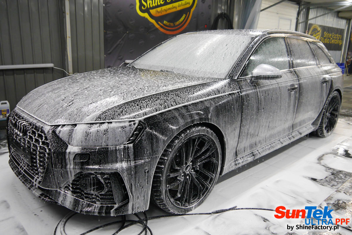 Zabezpieczenie frontów aut bezbarwnymi foliami ochronnymi staje się powoli standardem, coraz częściej także zabezpieczane w ten sposób są auta w całości co daje do tego czasu nieosiągalne perfekcyjne zabezpieczenie i efekt wizualny. Tym razem mieliśmy przyjemność zająć się Audi RS4 które zostało nam powierzone po niewielkim przebiegu. Decyzja wz. z zabezpieczeniem padła na bezkompromisowe połączanie znakomitych bezbarwnych folii ochronnych SunTek Ultra PPF z 10 letnią gwarancją oraz pakietu powłok ceramicznych. Standardowo prace zaczęliśmy od bardzo dokładnego oczyszczenia nadwozia z wszelkich naleciałości. Kolejno zajęliśmy się inspekcją lakieru i skorygowaniem oraz doprowadzeniem go do możliwej perfekcji z defektów posalonowych / potransportowych. Po przygotowaniu przeszliśmy do zabezpieczenia auta, najpierw aplikując bezbarwne folie ochronne. Folie zazwyczaj aplikuje się na najbardziej narażone el. auta jak przód, tym razem zdecydowaliśmy się praktycznie całe auto pokryć najlepszymi na świecie regeneracyjnymi foliami SunTek Ultra aby uzyskać 100% ochronę lakieru, który będzie całkowicie izolowany od środowiska zewnętrznego i nic nie będzie wstanie go uszkodzić. Po aplikacji folii przeszliśmy do zabezpieczania wszelkich el. auta powłokami, zaaplikowaliśmy pakiet powłok na całe auto, folie, szyby (Gtechniq G1), felgi (DLUX), elementy nielakierowane, a także całe wnętrze wraz z zaimpregnowaniem delikatnych skór. Po kilkudziesięciu godzinach pracy Audi nabrało perfekcyjnego wyglądu, połysku oraz co najważniejsze najmocniejszej praktycznie pancernej ochrony na lata. Zapraszamy do szerokiej fotorelacji!