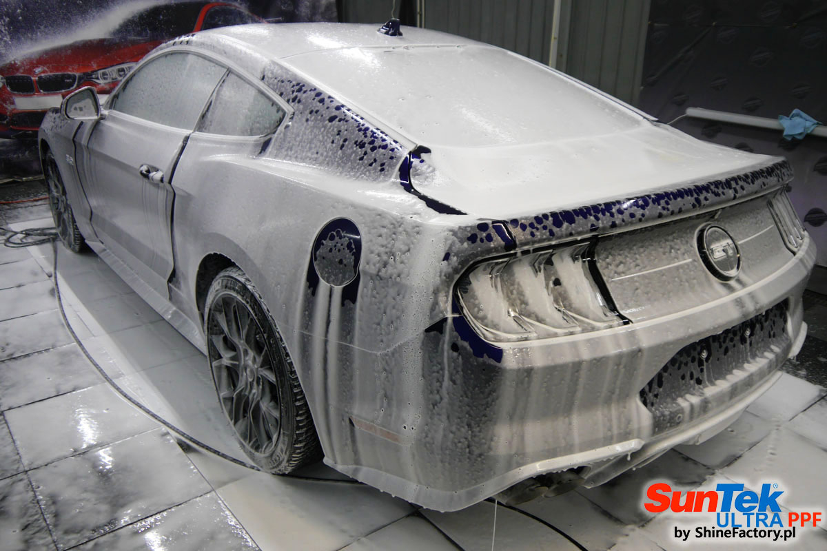 Zabezpieczenie frontów aut bezbarwnymi foliami ochronnymi staje się powoli standardem, coraz częściej także zabezpieczane w ten sposób są auta w całości co daje do tego czasu nieosiągalne perfekcyjne zabezpieczenie i efekt wizualny. Tym razem mieliśmy przyjemność zająć się Ford Mustang GT, który został nam powierzony wprost po wyjeździe z salonu. Decyzja wz. z zabezpieczeniem padła na bezkompromisowe połączanie znakomitych bezbarwnych folii ochronnych SunTek Ultra PPF z 10 letnią gwarancją oraz pakietu powłok ceramicznych. Standardowo prace zaczęliśmy od bardzo dokładnego oczyszczenia nadwozia z wszelkich naleciałości. Kolejno zajęliśmy się inspekcją lakieru i skorygowaniem oraz doprowadzeniem go do możliwej perfekcji z defektów które do tej pory znalazły się na lakierze. Po przygotowaniu przeszliśmy do zabezpieczenia auta, najpierw aplikując bezbarwne folie ochronne. Folie zazwyczaj aplikuje się na najbardziej narażone el. auta jak przód, tym razem zdecydowaliśmy się praktycznie całe auto pokryć najlepszymi na świecie regeneracyjnymi foliami SunTek Ultra aby uzyskać 100% ochronę lakieru, który będzie całkowicie izolowany od środowiska zewnętrznego i nic nie będzie wstanie go uszkodzić. Po aplikacji folii przeszliśmy do zabezpieczania wszelkich el. auta powłokami, zaaplikowaliśmy pakiet powłok na całe auto, folie, szyby (Gtechniq G1), felgi (DLUX), elementy nielakierowane, a także całe wnętrze wraz z zaimpregnowaniem delikatnych skór. Po kilkudziesięciu godzinach pracy Mustang nabrał perfekcyjnego wyglądu, połysku oraz co najważniejsze najmocniejszej praktycznie pancernej ochrony na lata. Zapraszamy do szerokiej fotorelacji!