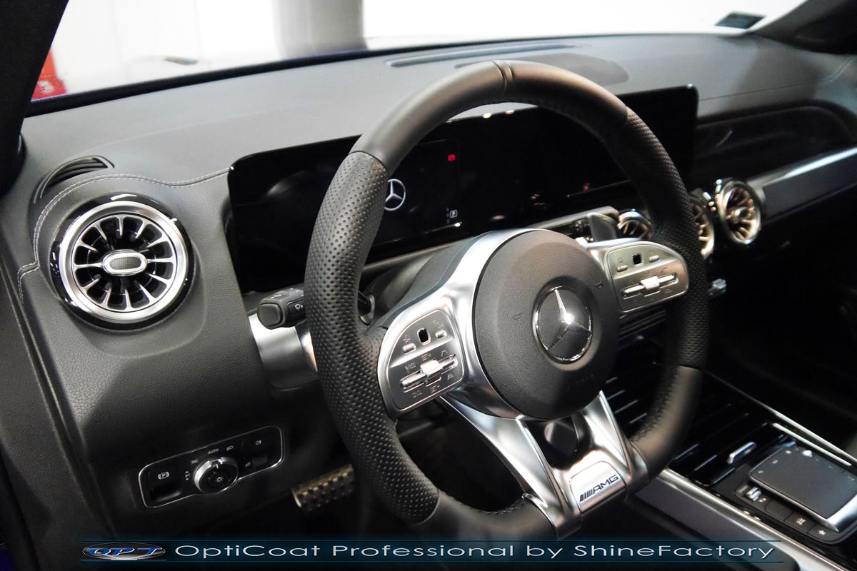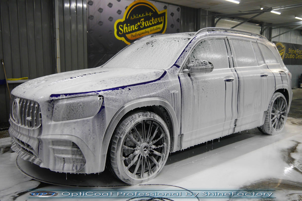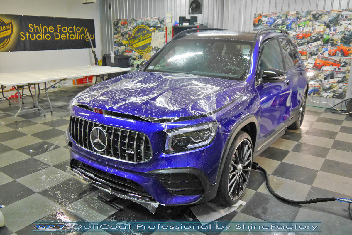 Połączenie bezbarwnych samo-regeneracyjnych folii oraz powłok ceramicznych staje się powoli standardem w idealnym zabezpieczeniu nowego auta. Tym razem mieliśmy przyjemność zająć się nowym Mercedesem GLB. Auto zostało przez nas maksymalnie zabezpieczone przed wszystkimi możliwymi uszkodzeniami. Wykorzystane do tego zostały najlepsze na rynku bezbarwne folie ochronne SunTek Ultra PPF oraz natryskowa ceramika OptiCoat PRO. Oczywiście prace rozpoczęliśmy od dokładnego oczyszczenia całego nadwozia z naleciałości oraz delikatnej korekty lakieru w celu usunięcia potransporotwych i posalonowych niedoskonałości. Następnie przystąpiliśmy do aplikacji bezbarwnych folii ochronnych na najbardziej narażone na mocne uszkodzenia el. auta, oczywiście zdecydowaliśmy się jak zawsze wybrać produkt bezkonkurencyjny i nowoczesny na rynku, czyli folie regeneracyjne SunTek Ultra PPF. Po aplikacji folii przeszliśmy do zabezpieczania wszelkich el. auta powłokami, zaaplikowaliśmy w natryskowy sposób grubą warstwę powłoki 9H+ Optimum OptiCoat Professional potwierdzoną testami TUV, pokrywając ją dla maksymalnego efektu wizualnego powłoką GlossCoat, która na końcu została utwardzona w odpowiedniej temp. lampami IR. Oczywiście zajęliśmy się, także zabezpieczeniem pakietem powłok wszelkich innych elementów jak szyby (Gtechniq G1), felgi (DLUX), lampy czy elementy nielakierowane, a także całe wnętrze wraz z zaimpregnowaniem delikatnych skór. Po kilkudziesięciu godzinach pracy Mercedes nabrał perfekcyjnego wyglądu, połysku oraz co najważniejsze najmocniejszej praktycznie pancernej ochrony na lata. Zapraszamy do szerokiej fotorelacji! Oklejone zostały przednie elementy auta głównie w celu ochrony przed mocnymi mechanicznymi uszkodzeniami jak np. odpryski od kamieni, piaskowanie od żwiru drogowego, mocniejszymi rysami, obiciami czy nawet drobnymi obcierkami parkingowymi.