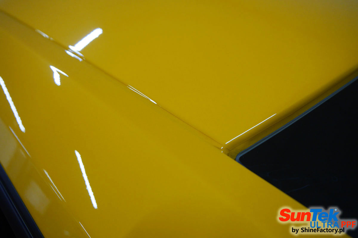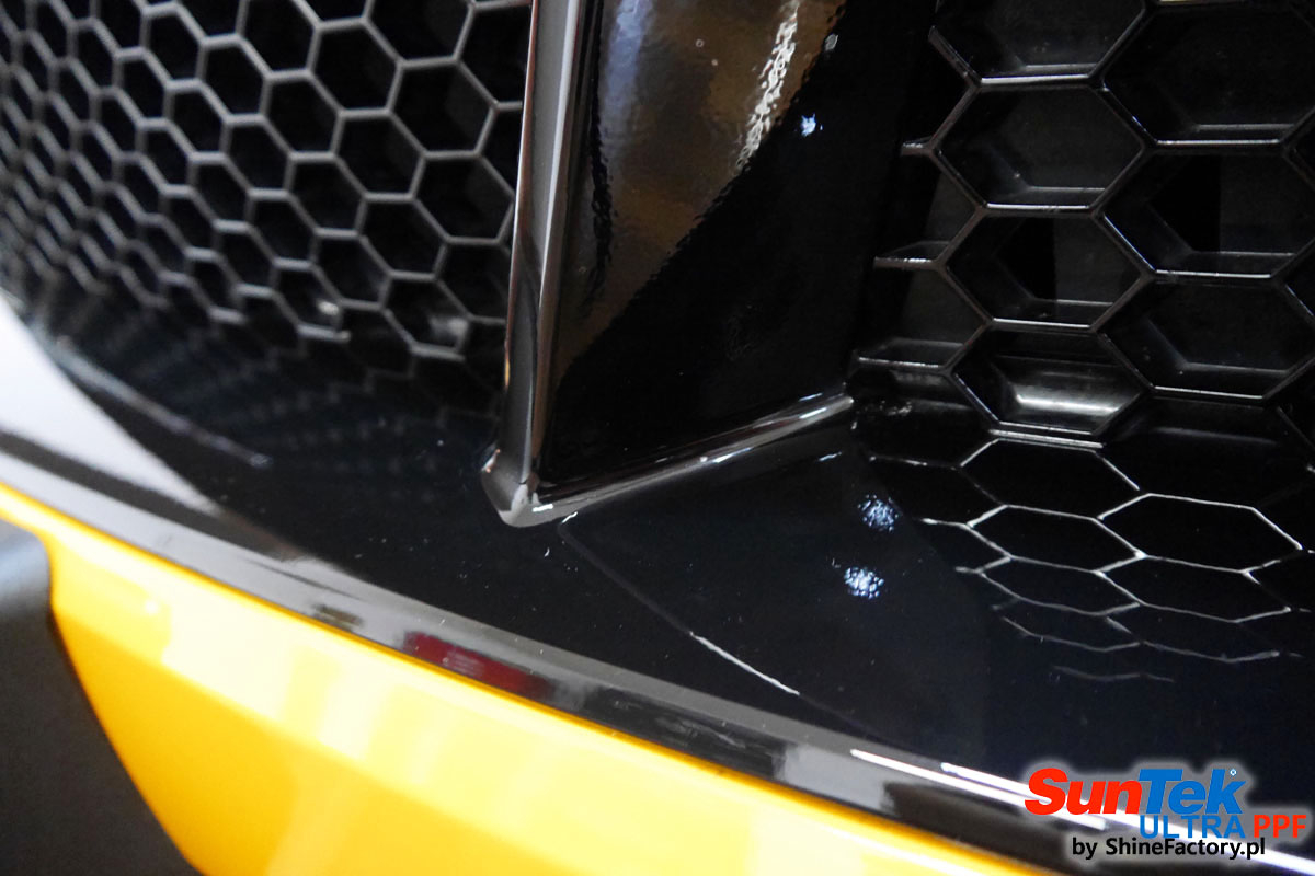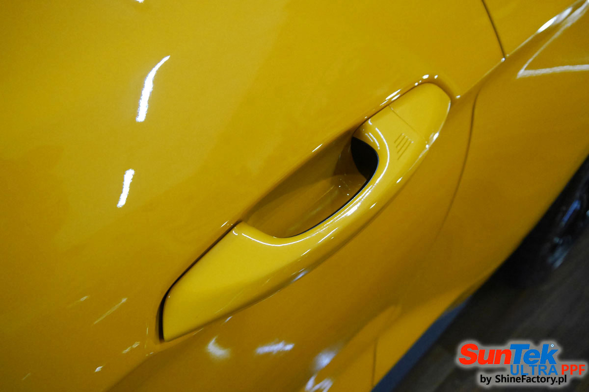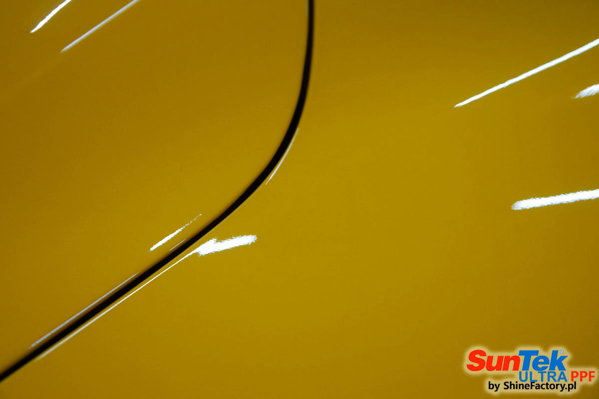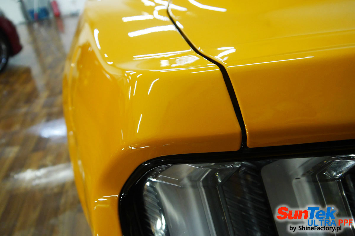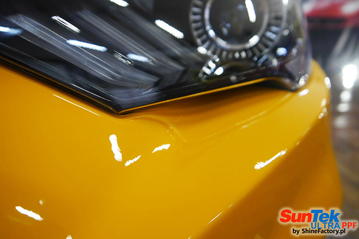 Zabezpieczenie frontów aut bezbarwnymi foliami ochronnymi staje się powoli standardem, coraz częściej także zabezpieczane w ten sposób są auta w całości co daje do tego czasu nieosiągalne perfekcyjne zabezpieczenie i efekt wizualny. Tym razem mieliśmy przyjemność zająć się Ford Mustang GT, który został nam powierzony z niewielkim przebiegiem. Decyzja wz. z zabezpieczeniem padła na bezkompromisowe połączanie znakomitych bezbarwnych folii ochronnych SunTek Ultra PPF z 10 letnią gwarancją oraz pakietu powłok ceramicznych. Standardowo prace zaczęliśmy od bardzo dokładnego oczyszczenia nadwozia z wszelkich naleciałości. Kolejno zajęliśmy się inspekcją lakieru i skorygowaniem oraz doprowadzeniem go do możliwej perfekcji z defektów które do tej pory znalazły się na lakierze. Po przygotowaniu przeszliśmy do zabezpieczenia auta, najpierw aplikując bezbarwne folie ochronne. Folie zazwyczaj aplikuje się na najbardziej narażone el. auta jak przód, tym razem zdecydowaliśmy się praktycznie całe auto pokryć najlepszymi na świecie regeneracyjnymi foliami SunTek Ultra aby uzyskać 100% ochronę lakieru, który będzie całkowicie izolowany od środowiska zewnętrznego i nic nie będzie wstanie go uszkodzić. Po aplikacji folii przeszliśmy do zabezpieczania wszelkich el. auta powłokami, zaaplikowaliśmy pakiet powłok na całe auto, folie, szyby (Gtechniq G1), felgi (DLUX), elementy nielakierowane, a także całe wnętrze wraz z zaimpregnowaniem delikatnych skór. Po kilkudziesięciu godzinach pracy Mustang nabrał perfekcyjnego wyglądu, połysku oraz co najważniejsze najmocniejszej praktycznie pancernej ochrony na lata. Zapraszamy do szerokiej fotorelacji!