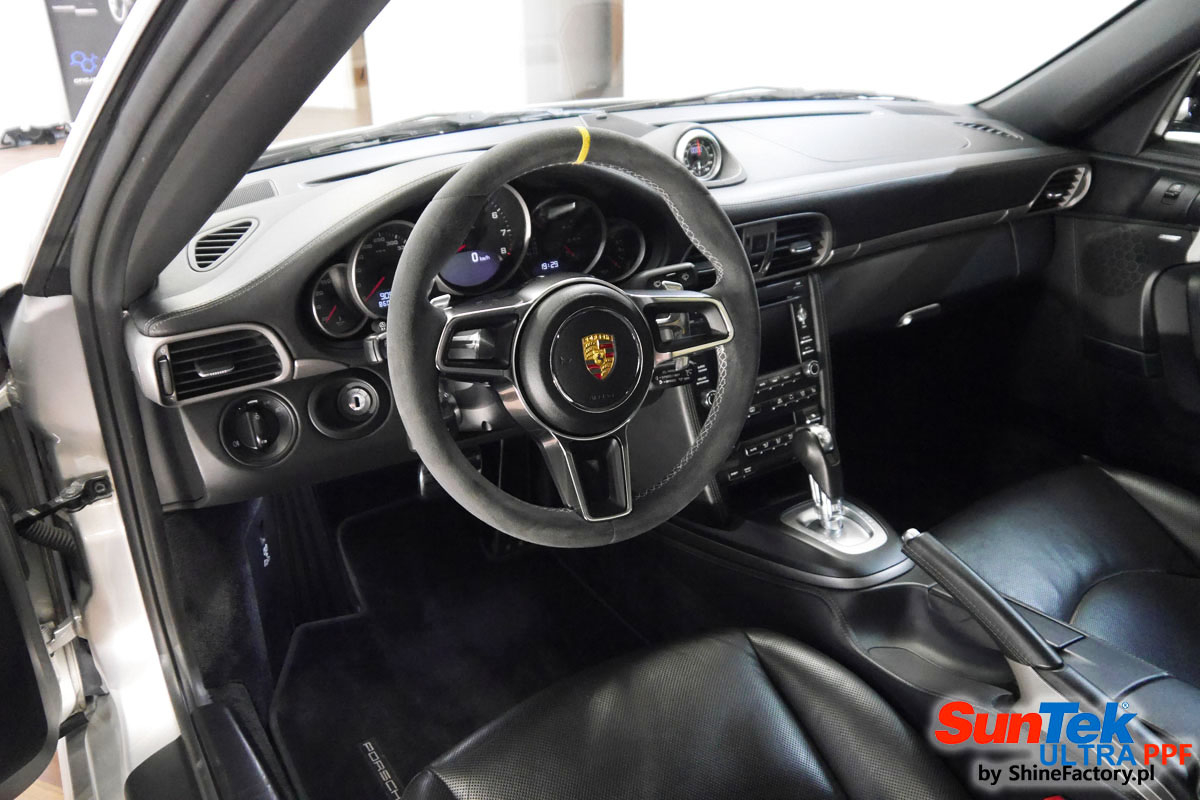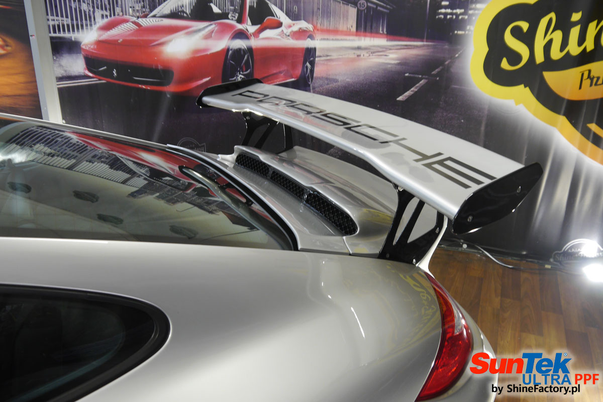 Zabezpieczenie frontów aut bezbarwnymi foliami ochronnymi staje się powoli standardem, coraz częściej także zabezpieczane w ten sposób są auta w całości co daje do tego czasu nieosiągalne perfekcyjne zabezpieczenie i efekt wizualny. Tym razem mieliśmy przyjemność zająć się zmodyfikowanym Porsche 911 naszego stałego klienta. Decyzja wz. z zabezpieczeniem padła na bezkompromisowe połączanie znakomitych bezbarwnych folii ochronnych SunTek Ultra PPF z 10 letnią gwarancją oraz pakietu powłok ceramicznych. Standardowo prace zaczęliśmy od bardzo dokładnego oczyszczenia nadwozia z wszelkich naleciałości. Kolejno zajęliśmy się inspekcją lakieru i skorygowaniem oraz doprowadzeniem go do możliwej perfekcji. Po przygotowaniu przeszliśmy do zabezpieczenia każdego cm auta, najpierw aplikując bezbarwne folie ochronne. Folie zazwyczaj aplikuje się na najbardziej narażone el. auta jak przód, tym razem zdecydowaliśmy się praktycznie całe auto pokryć najlepszymi na świecie regeneracyjnymi foliami SunTek Ultra aby uzyskać 100% ochronę lakieru, który będzie całkowicie izolowany od środowiska zewnętrznego i nic nie będzie wstanie go uszkodzić. Po aplikacji folii przeszliśmy do zabezpieczania wszelkich el. auta powłokami, zaaplikowaliśmy pakiet powłok na całe auto, folie, szyby (Gtechniq G1), felgi (DLUX), elementy nielakierowane, a także całe wnętrze wraz z zaimpregnowaniem delikatnych skór. Po kilkudziesięciu godzinach pracy Porsche nabrało perfekcyjnego wyglądu, połysku oraz co najważniejsze najmocniejszej praktycznie pancernej ochrony na lata. Zapraszamy do szerokiej fotorelacji!