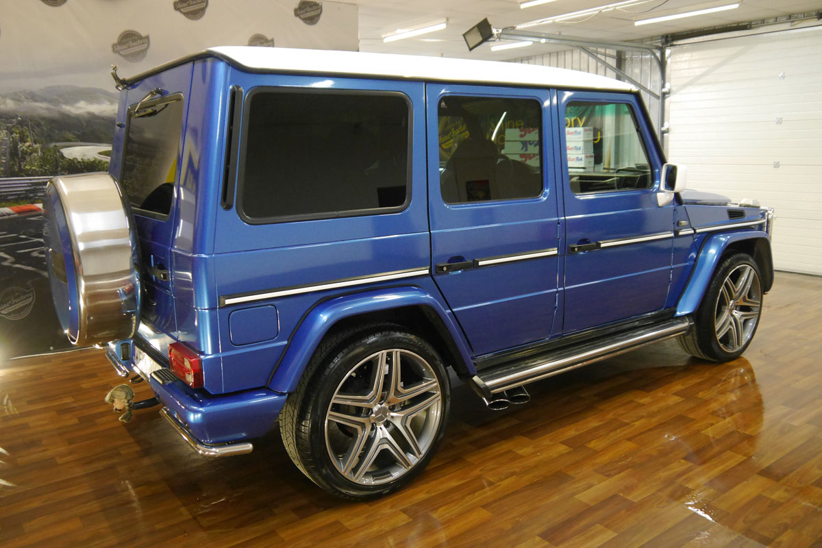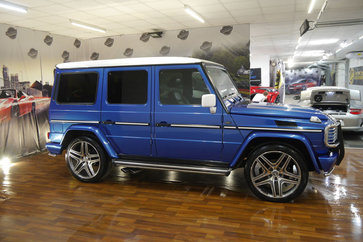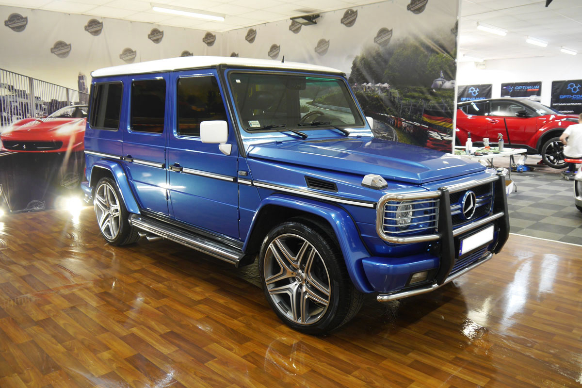 Zapraszamy także wszystkich, którzy chcą odmienić wizualnie swoje auto. Tutaj przykładowa zmiana koloru używanego Mercedesa G z koloru srebrnego na niebieski metaliczny. Przed oklejeniem lakier i jego niedoskonałości zostały poprawione lakierniczo.