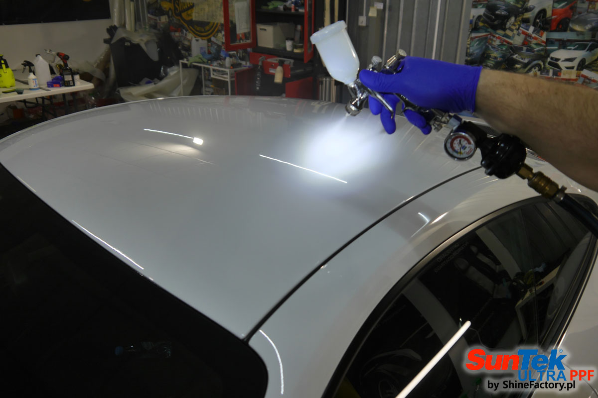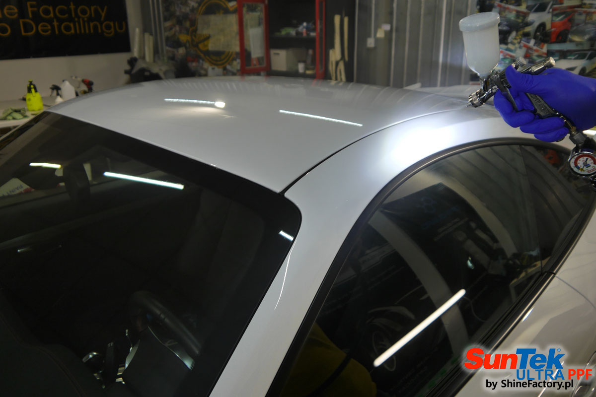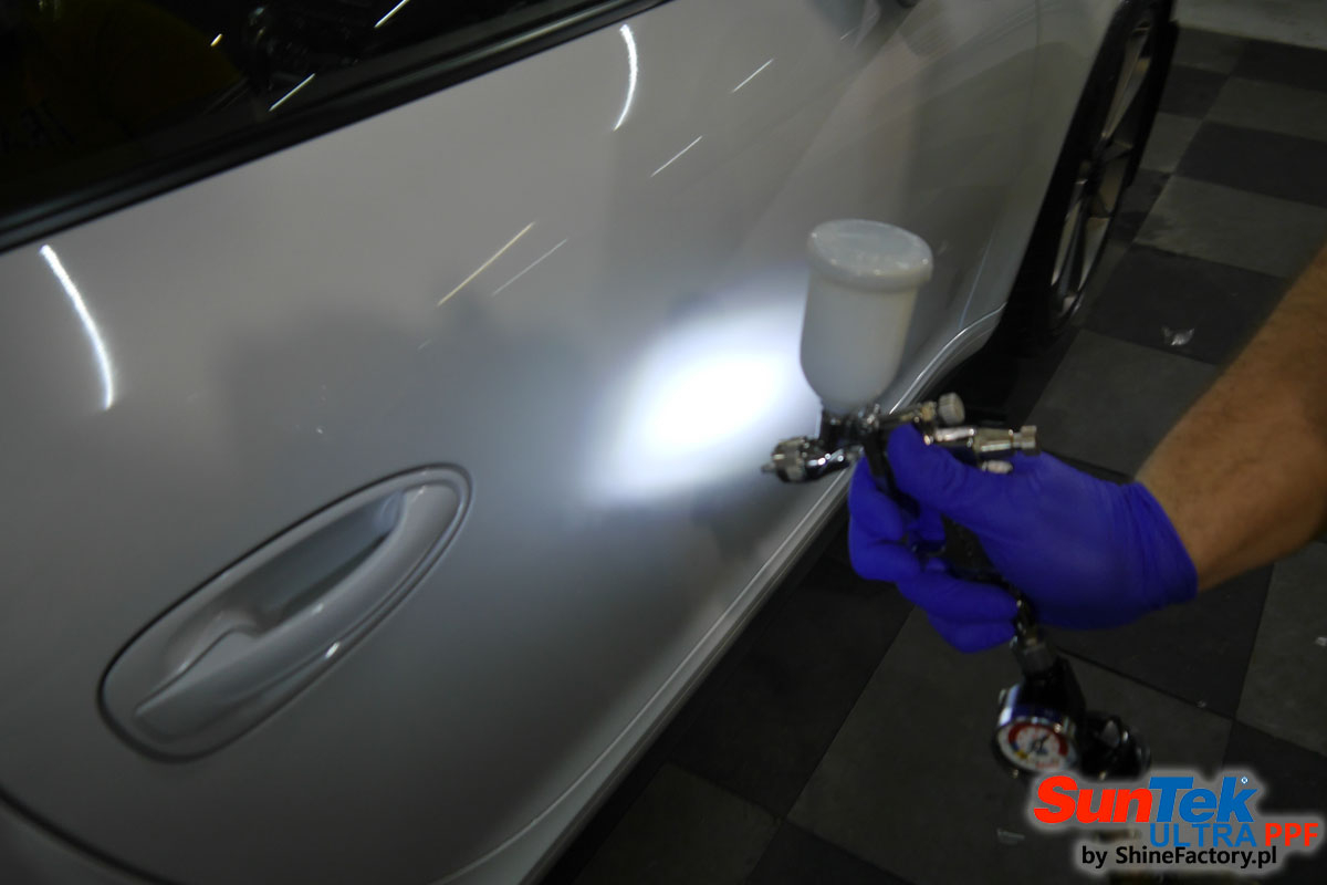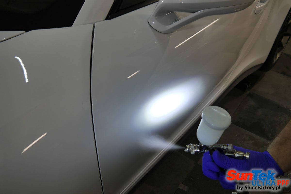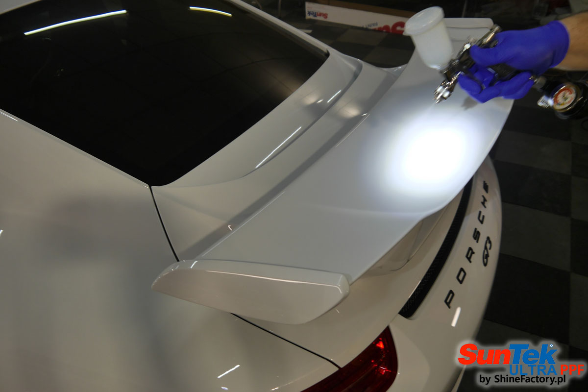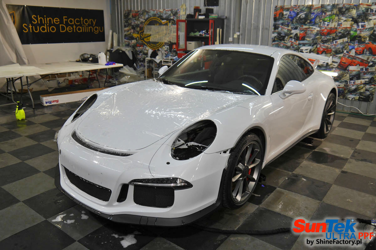 Połączenie bezbarwnych samo-regeneracyjnych folii oraz powłok ceramicznych staje się powoli standardem w idealnym zabezpieczeniu nowego auta. Tym razem mieliśmy przyjemność zająć się Porsche GT3 z symbolicznym przebiegiem. Auto zostało przez nas maksymalnie zabezpieczone przed wszystkimi możliwymi uszkodzeniami. Wykorzystane do tego zostały najlepsze na rynku bezbarwne folie ochronne SunTek Ultra PPF oraz natryskowa ceramika OptiCoat PRO. Oczywiście prace rozpoczęliśmy od dokładnego oczyszczenia całego nadwozia z naleciałości oraz delikatnej korekty lakieru w celu usunięcia niedoskonałości. Następnie przystąpiliśmy do aplikacji bezbarwnych folii ochronnych na najbardziej narażone na mocne uszkodzenia el. auta, oczywiście zdecydowaliśmy się jak zawsze wybrać produkt bezkonkurencyjny i nowoczesny na rynku, czyli folie regeneracyjne SunTek Ultra PPF. Po aplikacji folii przeszliśmy do zabezpieczania wszelkich el. auta powłokami, zaaplikowaliśmy w natryskowy sposób grubą warstwę powłoki 9H+ Optimum OptiCoat Professional potwierdzoną testami TUV, pokrywając ją dla maksymalnego efektu wizualnego powłoką GlossCoat, która na końcu została utwardzona w odpowiedniej temp. lampami IR. Oczywiście zajęliśmy się, także zabezpieczeniem pakietem powłok wszelkich innych elementów jak szyby (Gtechniq G1), felgi (DLUX), lampy czy elementy nielakierowane, a także całe wnętrze wraz z zaimpregnowaniem delikatnych skór. Po kilkudziesięciu godzinach pracy Porsche nabrało perfekcyjnego wyglądu, połysku oraz co najważniejsze najmocniejszej praktycznie pancernej ochrony na lata. Zapraszamy do szerokiej fotorelacji! Oklejone zostały przednie elementy auta głównie w celu ochrony przed mocnymi mechanicznymi uszkodzeniami jak np. odpryski od kamieni, piaskowanie od żwiru drogowego, mocniejszymi rysami, obiciami czy nawet drobnymi obcierkami parkingowymi.