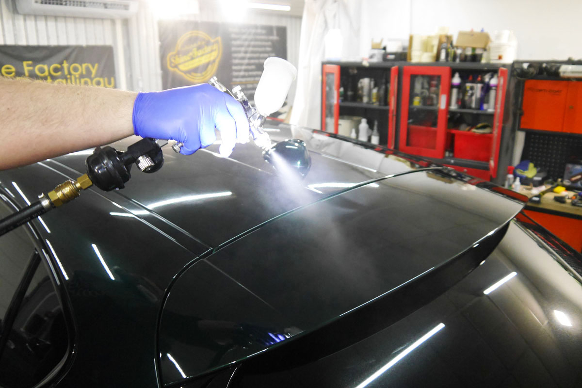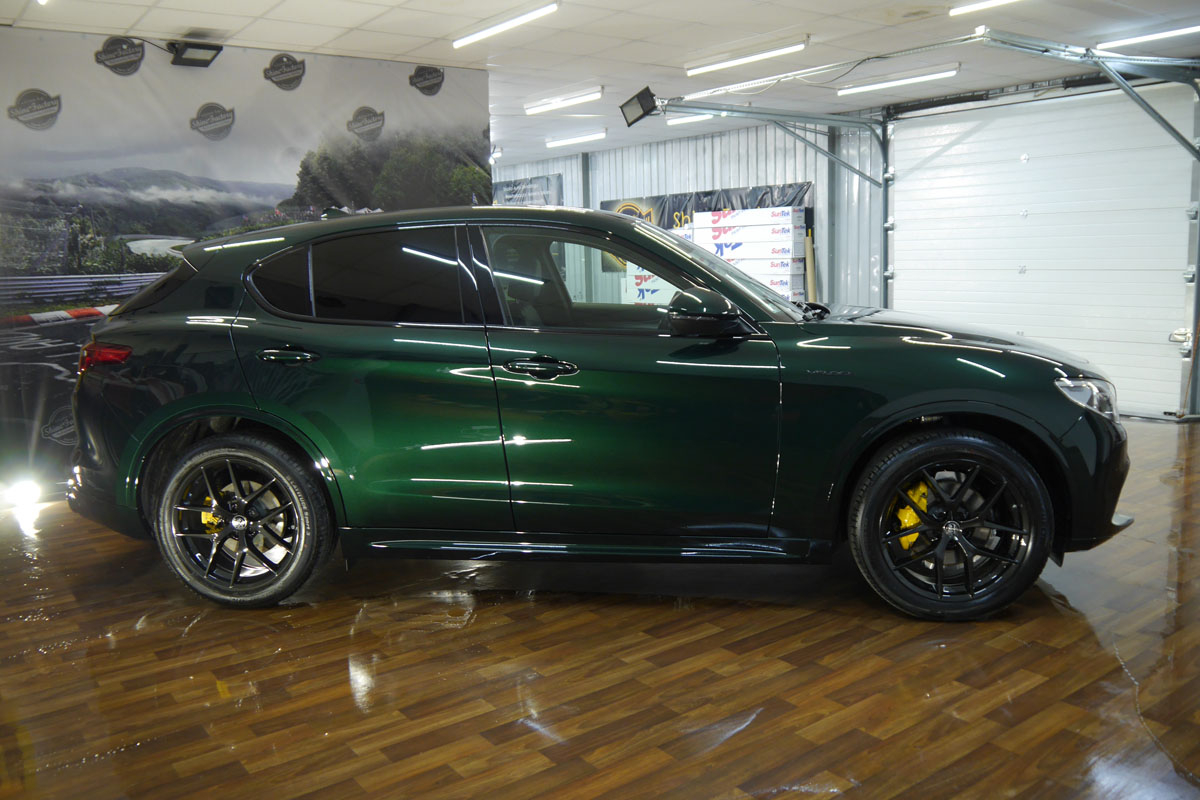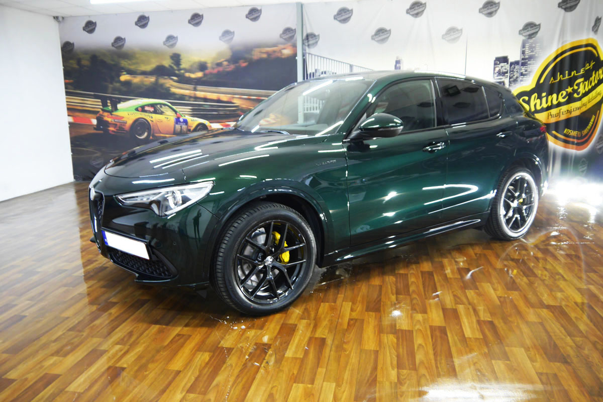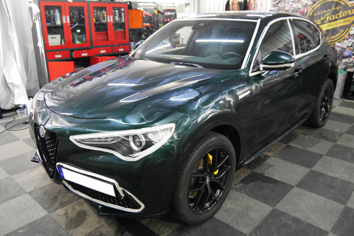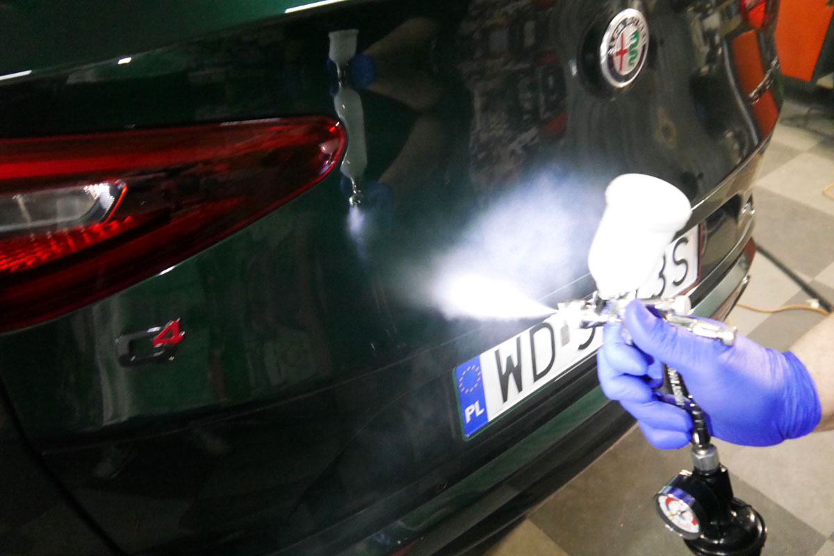 Witamy. Tym razem chcemy przedstawić fotorelację z prac nad salonowo nową Alfa Romeo Stelvio, która trafiła do nas w celu zabezpieczenia lakieru pakietem powłok ceramicznych. Prace nad nadwoziem rozpoczęliśmy od dokładnego oczyszczenia i odtłuszczenia, następnie lakier przeszedł delikatną korektę w celu usunięcia po salonowych niedoskonałości. Po tych czynnościach przeszliśmy do aplikacji powłok na wszelkie elementy jak lakier, szyby (bezapelacyjnie najlepszą powłoką Gtechniq G1), felgi (powłoka grafenowa), detale itp itd. Najważniejsze, na sam lakier zaaplikowaliśmy maksymalnie grubą natryskową warstwę kompozytu ceramicznego Ceramic Spray Coat (100% powłoki na aucie) z dodatkową warstwą GlassCoat, która zapewni ochronę, zminimalizowane brudzenie oraz ułatwione do maksimum mycie. Dzięki detailingowi oraz finalnemu pokryciu ceramiką auto przez długi czas będzie cieszyło oko idealną prezentacją lakieru. Zapraszamy do szerokiej fotorelacji i zdjęć efektu końcowego!