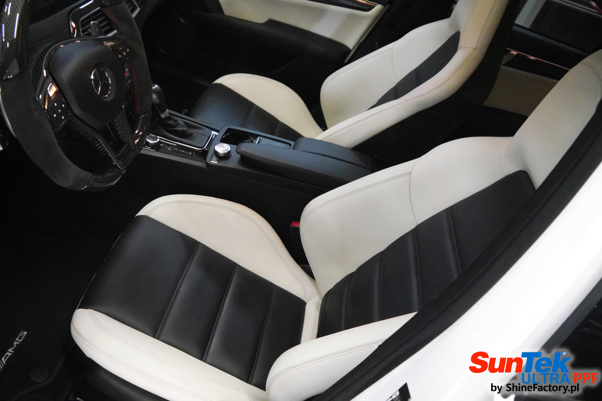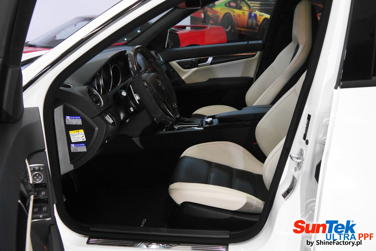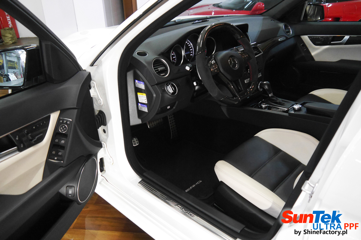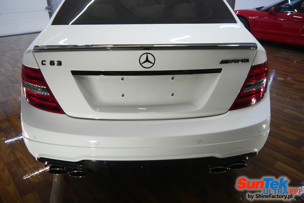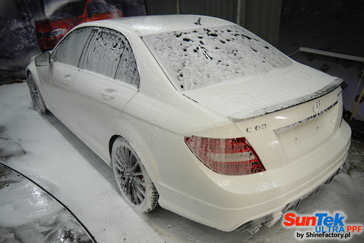 Zabezpieczenie frontów aut bezbarwnymi foliami ochronnymi staje się powoli standardem, coraz częściej także zabezpieczane w ten sposób są auta w całości co daje do tego czasu nieosiągalne perfekcyjne zabezpieczenie i efekt wizualny. Tym razem mieliśmy przyjemność zająć się Mercedesem AMG C63 naszego stałego klienta. Decyzja wz. z zabezpieczeniem padła na bezkompromisowe połączanie znakomitych bezbarwnych folii ochronnych SunTek Ultra PPF z 10 letnią gwarancją oraz pakietu powłok ceramicznych. Standardowo prace zaczęliśmy od bardzo dokładnego oczyszczenia nadwozia z wszelkich naleciałości. Kolejno zajęliśmy się inspekcją lakieru i skorygowaniem oraz doprowadzeniem go do możliwej perfekcji. Po przygotowaniu przeszliśmy do zabezpieczenia każdego cm auta, najpierw aplikując bezbarwne folie ochronne. Folie zazwyczaj aplikuje się na najbardziej narażone el. auta jak przód, tym razem zdecydowaliśmy się praktycznie całe auto pokryć najlepszymi na świecie regeneracyjnymi foliami SunTek Ultra aby uzyskać 100% ochronę lakieru, który będzie całkowicie izolowany od środowiska zewnętrznego i nic nie będzie wstanie go uszkodzić. Po aplikacji folii przeszliśmy do zabezpieczania wszelkich el. auta powłokami, zaaplikowaliśmy pakiet powłok na całe auto, folie, szyby (Gtechniq G1), felgi (powłoka grafenowa), elementy nielakierowane, a także całe wnętrze wraz z zaimpregnowaniem delikatnych skór. Po kilkudziesięciu godzinach pracy Mercedes nabrał perfekcyjnego wyglądu, połysku oraz co najważniejsze najmocniejszej praktycznie pancernej ochrony na lata. Zapraszamy do szerokiej fotorelacji!