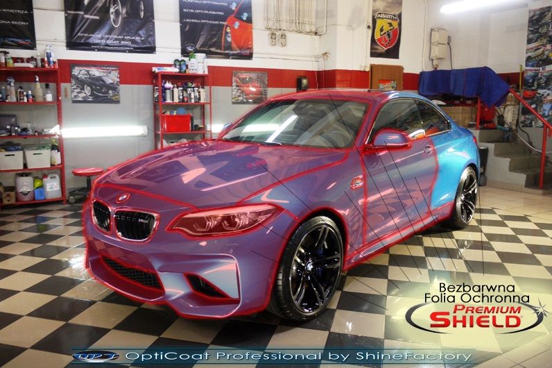 Witamy! Kolejny raz mieliśmy za zadanie przeprowadzić perfekcyjne zabezpieczenie auta aby przez lata było odporne na wszelkie uszkodzenia i zawsze wyglądało idealnie. BMW M2 praktycznie zaraz po wyjeździe z salonu zostało przez nas zabezpieczone pakietem powłok ceramicznych oraz bezbarwnymi foliami ochronnymi. Oczywiście prace rozpoczęliśmy od zdjęcia z auta kół i zabezpieczenia nadkoli, felg oraz zacisków hamulcowych powłokami ceramicznymi. Kolejno przeszliśmy do dokładnego oczyszczenia całego nadwozia z naleciałości oraz usunięcia już zaistniałych uszkodzeń jak wżery po owadach, mikrorys czy zmatowień. Następnie przystąpiliśmy do aplikacji bezbarwnych folii ochronnych na najbardziej narażone na mocne uszkodzenia el. auta, oczywiście zdecydowaliśmy się jak zawsze wybrać produkt bezkonkurencyjny i nowoczesny na rynku, czyli folie Premium Shield Elite. Po aplikacji folii przeszliśmy do zabezpieczania wszelkich el. auta powłokami, zaaplikowaliśmy w natryskowy sposób grubą warstwę powłoki 9H+ Optimum OptiCoat Professional potwierdzoną testami TUV, pokrywając ją dla maksymalnego efektu wizualnego powłoką GlossCoat, która na końcu została utwardzona w odpowiedniej temp. lampami IR. Oczywiście zajęliśmy się, także zabezpieczeniem pakietem powłok wszelkich innych elementów jak szyby (Gtechniq G1), felgi (DLUX), lampy czy elementy nielakierowane . Nie pominęliśmy zajęcia się komorą silnika oraz wnętrzem aby zabezpieczyć je w każdym detalu różnymi kosmetykami. Po kilkudziesięciu godzinach pracy BMW nabrało perfekcyjnego wyglądu, połysku oraz co najważniejsze najmocniejszej praktycznie pancernej ochrony na lata. Zapraszamy do szerokiej fotorelacji! Oklejone zostały przednie elementy głównie w celu ochrony przed mocnymi mechanicznymi uszkodzeniami jak np. odpryski od kamieni, piaskowanie od żwiru drogowego, mocniejszymi rysami czy nawet drobnymi obcierkami parkingowymi. Dokładnie oklejone zostały: Cały zderzak przedni Cała maska Całe błotniki Klosze lamp Przednie słupki Przód dachu Lusterka Progi Drzwi Półka tylnego bagażnika Zapraszamy do zdjęć z prac i efekt końcowego, jak widać folia posiada bardzo duży połysk i przejrzystość dzięki czemu jest praktycznie nie zauważalna.