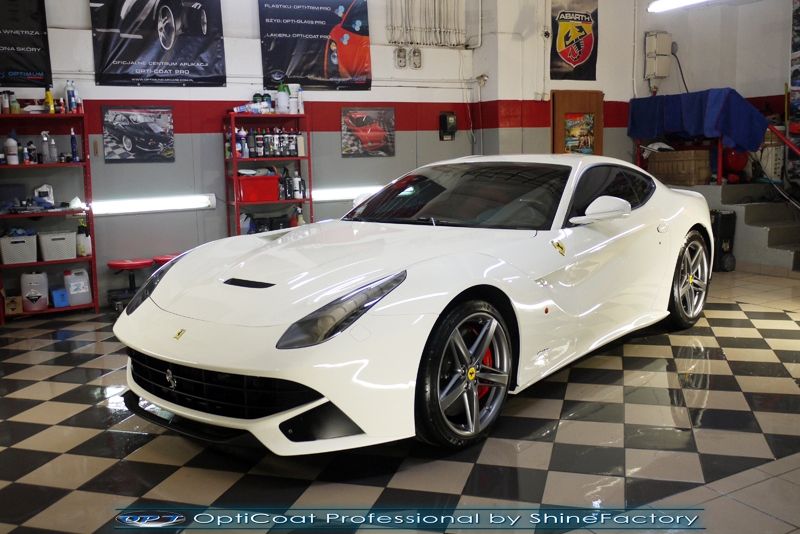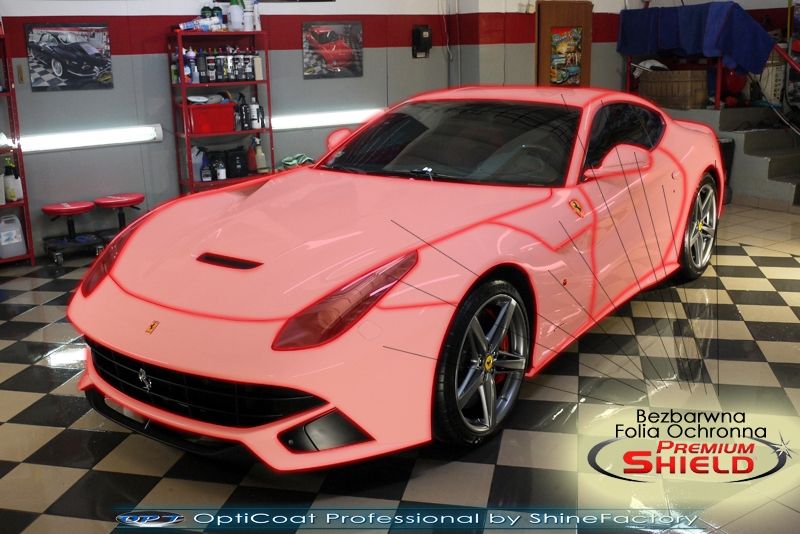Przez wiele lat działalności zajmowaliśmy się setkami różnych aut, tym razem z dumą zapraszamy do naszego najbardziej rozbudowanego projektu detailingu. Przepiękne Ferrari Berlinetta zostało nam powierzone w celu maksymalnie kompleksowego detailingu oraz najlepszego na świcie zabezpieczenia całego auta. Decyzja padła oczywiście na połączanie znakomitych bezbarwnych folii ochronnych Premium Shield oraz pakietu powłok ceramicznych. Oczywiście standardowo prace zaczęliśmy od demontażu kół aby zająć się dokładnie nadkolami, zaciskami i felgami. Następnie dokładnie oczyściliśmy nadwozie z wszelkich naleciałości. Sam lakier który posiadał bardzo dużą ilość niedoskonałości, mikrorys, zmatowień został poddany pełnej korekcie aby uzyskać perfekcyjny efekt wizualny przed zabezpieczaniem. Po przygotowaniu przeszliśmy do zabezpieczenia auta, najpierw aplikując bezbarwne folie ochronne. Folie zazwyczaj aplikuje się na najbardziej narażone el. auta jak przód, tym razem zdecydowaliśmy się całe auto w każdym elemencie pokryć najlepszymi na świecie foliami Premium Shield Elite aby uzyskać 100% ochronę lakieru, który będzie całkowicie izolowany od środowiska zewnętrznego i nic nie będzie wstanie go uszkodzić. Po aplikacji folii przeszliśmy do zabezpieczania wszelkich el. auta powłokami, zaaplikowaliśmy pakiet powłok na całe auto, folie, szyby (Gtechniq G1), felgi (DLUX), elementy nielakierowane czy końcówki wydechu. Nie pominęliśmy zajęcia się komorą ogromnego silnika V12 oraz przepięknym wnętrzem aby zabezpieczyć je w każdym detalu różnymi kosmetykami najwyższej klasy. Po kilkudziesięciu godzinach pracy Ferrari nabrało perfekcyjnego wyglądu, połysku oraz co najważniejsze najmocniejszej praktycznie pancernej ochrony na lata. Zapraszamy do szerokiej fotorelacji! Oklejone zostały wszystkie elementy auta w celu ochrony przed wszelkimi uszkodzeniami jak np. odpryski od kamieni, piaskowanie od żwiru drogowego, mocniejszymi rysami czy nawet drobnymi obcierkami parkingowymi. Dokładnie oklejone zostały: Zderzak przedni i tylny Maska Klosze lamp Błotniki przednie Drzwi Błotniki tylne Dach i słupki Progi Klapa bagażnika Lusterka Zapraszamy do zdjęć z prac i efekt końcowego, jak widać folia posiada bardzo duży połysk i przejrzystość dzięki czemu jest praktycznie nie zauważalna.