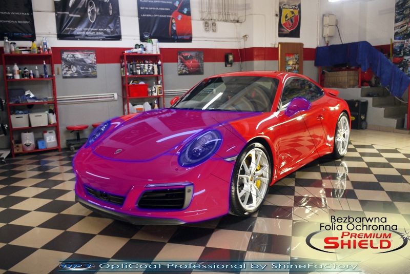 Ponownie mieliśmy okazję maksymalnie zabezpieczyć nowe auto przed wszystkimi możliwymi uszkodzeniami, czyli połączyć najlepsze na rynku bezbarwne folie ochronnych Premium Shield z ceramiką natryskową OptiCoat PRO. Oczywiście prace rozpoczęliśmy od zdjęcia z auta kół i zabezpieczenia nadkoli, felg oraz zacisków hamulcowych powłokami ceramicznymi. Kolejno przeszliśmy do dokładnego oczyszczenia całego nadwozia z naleciałości oraz usunięcia już zaistniałych uszkodzeń jak wżery po owadach, mikrorys czy zmatowień. Następnie przystąpiliśmy do aplikacji bezbarwnych folii ochronnych na najbardziej narażone na mocne uszkodzenia el. auta, oczywiście zdecydowaliśmy się jak zawsze wybrać produkt bezkonkurencyjny i nowoczesny na rynku, czyli folie Premium Shield Elite. Po aplikacji folii przeszliśmy do zabezpieczania wszelkich el. auta powłokami, zaaplikowaliśmy w natryskowy sposób grubą warstwę powłoki 9H+ Optimum OptiCoat Professional potwierdzoną testami TUV, pokrywając ją dla maksymalnego efektu wizualnego powłoką GlossCoat, która na końcu została utwardzona w odpowiedniej temp. lampami IR. Oczywiście zajęliśmy się, także zabezpieczeniem pakietem powłok wszelkich innych elementów jak szyby (Gtechniq G1), felgi (DLUX), lampy czy elementy nielakierowane . Nie pominęliśmy zajęcia się wnętrzem aby zabezpieczyć je w każdym detalu różnymi kosmetykami. Po kilkudziesięciu godzinach pracy Porsche nabrało perfekcyjnego wyglądu, połysku oraz co najważniejsze najmocniejszej praktycznie pancernej ochrony na lata. Zapraszamy do szerokiej fotorelacji! Oklejone zostały przednie elementy głównie w celu ochrony przed mocnymi mechanicznymi uszkodzeniami jak np. odpryski od kamieni, piaskowanie od żwiru drogowego, mocniejszymi rysami czy nawet drobnymi obcierkami parkingowymi. Dokładnie oklejone zostały: Cały zderzak przedni Cała maska Przody błotników Klosze lamp Lusterka Wnęki pod klamkami Ranty drzwi Zapraszamy do zdjęć z prac i efekt końcowego, jak widać folia posiada bardzo duży połysk i przejrzystość dzięki czemu jest praktycznie nie zauważalna.
