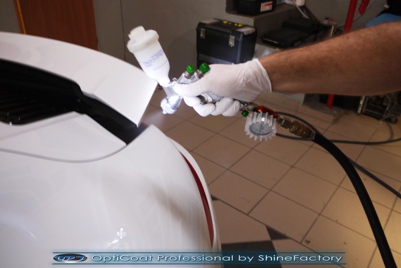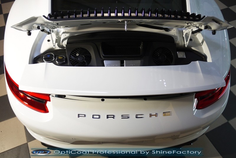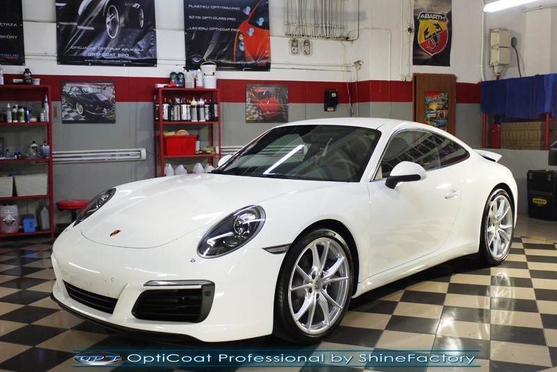 Witamy! Tym razem mieliśmy przyjemność zająć się najnowszym modelem Porsche 911 w białym niemetalicznym lakierze, które właściciel powierzył nam w celu wzmocnienia delikatnego lakieru w szczególności zabezpieczenia na powoli zbliżający się ciężki zimowy okres. Głównym zadaniem było zabezpieczenie całego nadwozia pakietem najlepszych powłok ceramicznych świata, dlatego prace rozpoczęliśmy od specjalistycznego dogłębnego oczyszczenia z zabrudzeń oraz fabrycznych zabezpieczeń. Lakier przed aplikacją zaawansowanego zabezpieczania został doprowadzony do ideału oraz dokładnie odtłuszczony. Następnie przeszliśmy do aplikacji powłok na każdy element auta jak lakier, szyby, plastiki, felgi itp itd. Na całe auto zaaplikowaliśmy poprzez metodę natryskową 100% kompozytu ceramicznego 9H+ opartego na SiC Optimum OptiCoat Professional połączoną z powłoką GlossCoat, która zapewniła maksymalny połysk i ochronę na bardzo długi czas. Po aplikacji, całe auto zostało wygrzane lampami IR w odpowiedniej temperaturze w celu utwardzenia powłok. Zapraszamy do fotorelacji z prac.
