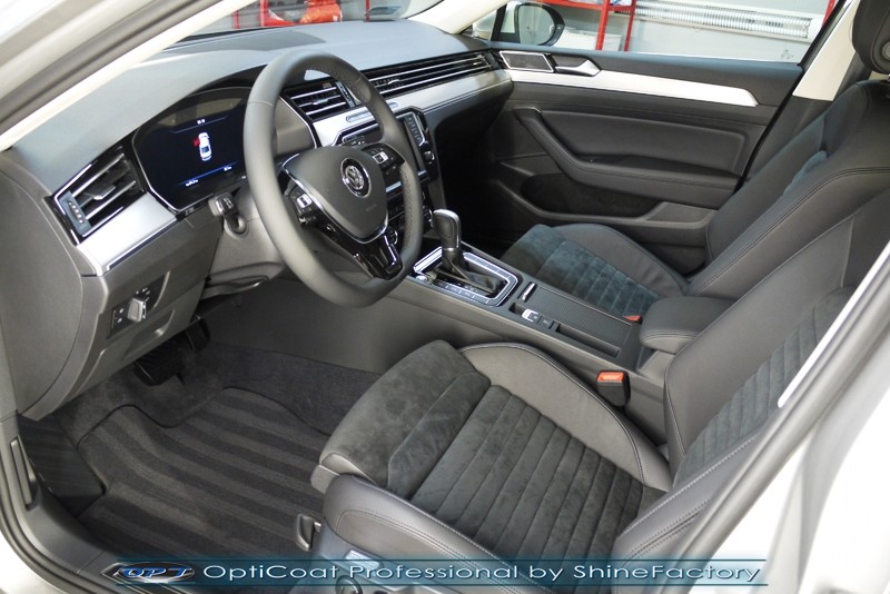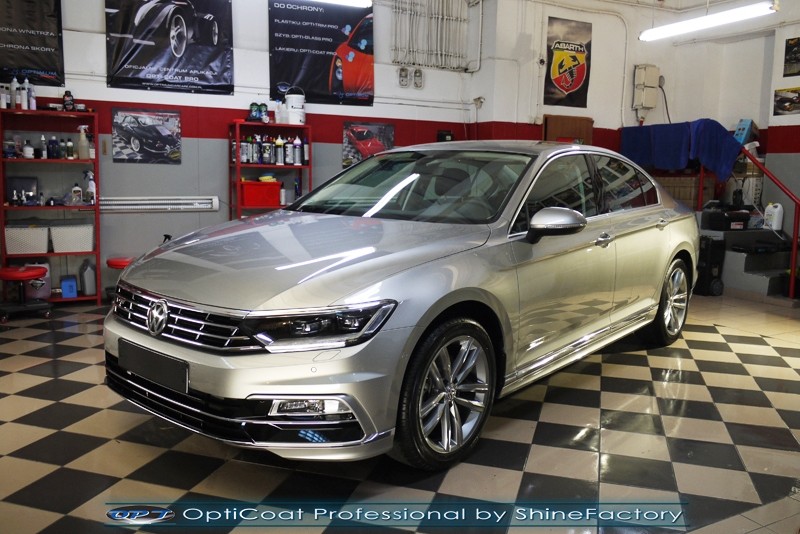 Dziś zapraszamy do relacji z zabezpieczenia fabrycznie nowego VW Passata w grafitowym kolorze. Auto trafiło do nas w celu zabezpieczenia pakietem powłok ceramicznych nadwozia oraz zaimpregnowania wnętrza. Oczywiście prace rozpoczęliśmy od dokładnego oczyszczenia całego nadwozia z naleciałości oraz zabezpieczeń fabrycznych i dogłębnego wyglinkowania lakieru. Następnie poprawiliśmy niedoskonałości pofabryczne oraz zaaplikowaliśmy w natryskowy sposób grubą warstwę powłoki 9H+ Optimum OptiCoat Professional potwierdzoną testami TUV, pokrywając ją dla maksymalnego efektu wizualnego powłoką GlossCoat, która na końcu została utwardzona w odpowiedniej temp. lampami IR. Oczywiście zajęliśmy się, także zabezpieczeniem pakietem powłok wszelkich innych elementów jak szyby (powłoką hydrofobową), felgi, lampy, elementy nielakierowane powłoką DLUX czy nawet końcówki wydechu. Zajęliśmy się, także komorą silnika oraz całym wnętrzem skupiając się na impregnacji el. skórzanych aby na długo były czyste, matowe oraz wzmocnione przed wycieraniem. Po kilkudziesięciu godzinach pracy auto nabrało perfekcyjnego wyglądu, głębi koloru oraz co najważniejsze najmocniejszej ceramicznej ochrony na bardzo długi czas. Zapraszamy do szerokiej fotorelacji!