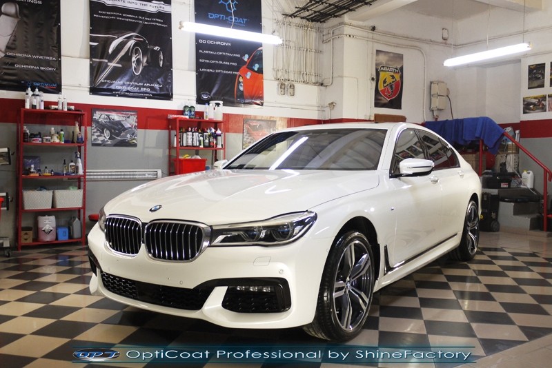 Witamy! Tym razem zapraszamy do fotorelacji z zabezpieczenia najnowszego modelu BMW 750i, które zostało nam powierzone przez naszego stałego klienta w celu jak najgrubszego i jak najmocniejszego możliwego zabezpieczenia powłoką ceramiczną. Zdecydowaliśmy się zabezpieczyć każdy element auta najlepszymi powłokami z rynku, sam lakier, aby uzyskać jak najgrubszą warstwę w natryskowy sposób, testowaną laboratoryjnie przez TUV ceramiką OptiCoat Professional. Oczywiście najpierw auto musiało zostać w specjalistyczny sposób dokładnie oczyszczone, następnie koniecznością przed aplikacją tak zaawansowanego zabezpieczenia konieczne było skorygowanie niedoskonałości pozostawionych w kilku miejscach przez salon/fabrykę. Po dokładnym przygotowaniu i odtłuszczeniu oraz precyzyjnym natryskowym zaaplikowaniu powłoki OC PRO lakier pokryliśmy dodatkową warstwą GlossCoat, która zapewniła maksymalny połysk i śliskość lakieru na wiele lat. Oczywiście całe wnętrze zostało zabezpieczone różnymi kosmetykami w najdrobniejszym detalu wraz z zaimpregnowaniem delikatnych skór. Pamiętaliśmy także o zabezpieczeniu komory silnika oraz po zdjęciu kół aplikacji powłoki na felgi, nadkola czy zaciski hamulcowe. Auto po kilku dniach prac nabrało połysku, idealnej bieli i co najważniejsze najlepszej ochrony co zapewni zminimalizowane brudzenie oraz banalne utrzymanie auta w perfekcyjnym stanie na wiele lat. Zapraszamy do szerokiej fotorelacji i zdjęć efektu końcowego!