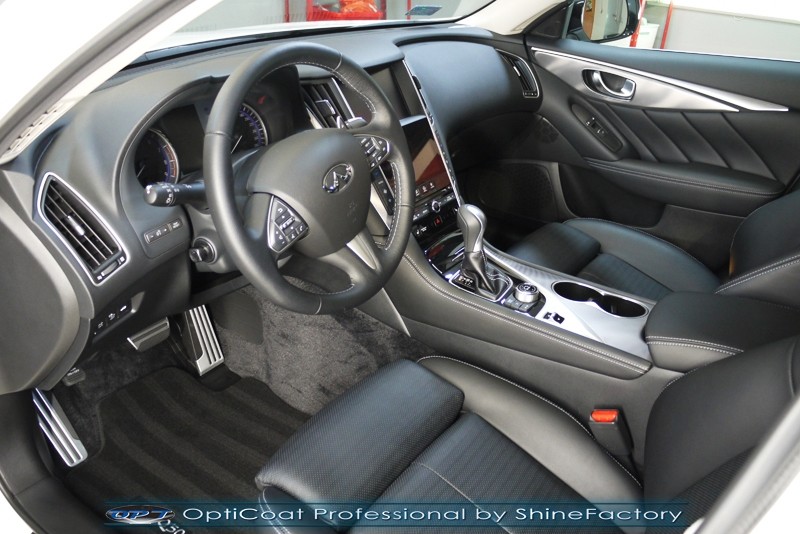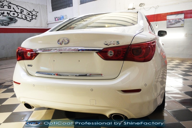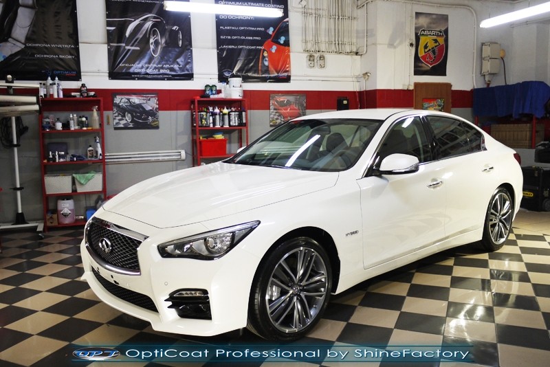 Witamy i zapraszamy do fotorelacji z zabezpieczenia salonowego Infiniti Q50s w bardzo delikatnym, japońskim, perłowo białym lakierze. Wymagane było zabezpieczenie każdego detalu auta w pakiecie NewShine. Zdecydowaliśmy się zabezpieczyć każdy element auta (felgi, szyby, lakier, inne elementy) najlepszymi powłokami z rynku, sam lakier testowaną w laboratoryjny sposób przez TUV powłoką ceramiczną OptiCoat Professional. Oczywiście najpierw auto musiało zostać w specjalistyczny sposób dokładnie oczyszczone, następnie koniecznością przed aplikacją zaawansowanego zabezpieczenia konieczne było odpowiednie przygotowanie i odtłuszczenie powierzchni lakieru. Finalnie zaaplikowaliśmy na lakier powłokę OptiCoat PRO opartą na SiC oraz utwardziliśmy w wysokiej temperaturze. Całe wnętrze zostało zabezpieczone różnymi kosmetykami w najdrobniejszym detalu, oczywiście wraz z cała skórzaną tapicerką. Nie zapomnieliśmy, także o zabezpieczeniu nadkoli, wnętrza felg czy komory silnika. Auto po kilku dniach prac nabrało maksymalnego połysku oraz co najważniejsze mocnej ochrony co zapewni zminimalizowane brudzenie oraz ułatwione utrzymanie auta w perfekcyjnym stanie na bardzo długi czas. Zapraszamy do fotorelacji i zdjęć efektu końcowego.