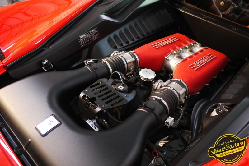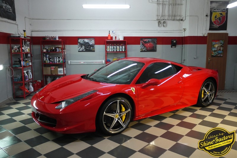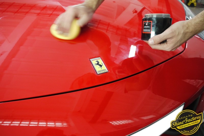 Witamy Was ponownie. Tym razem chcemy zaprezentować Wam relację z odświeżenia Ferrari Italia w pięknym kolorze Rosso Corsa. Właściciel przyprowadził nam auto w celu dokładnego oczyszczenia i odświeżenia lakieru któremu już coś brakowało.. nic dziwnego bo niestety był już dość mocno zmatowiały i porysowany. Niestety mieliśmy na to wszystko tylko jeden dzień, dlatego po dogłębnym oczyszczeniu lakieru, kół i wszelkich elementów, lakier został delikatnie skorygowany pastą Swissvax Cleaner Fluid Profesional a finalnie zabezpieczony woskiem Swissvax Concorso. Pozwoliło nam to usunąć oksydację i skorygować większość mikrorys, które psuły efekt wizualny pięknej czerwieni. Koła auta zostały nawoskowane trwałym woskiem syntetycznym, szyby zabezpieczone powłoką hydrofobową, wszelkie chromy spolerowane, elementy nielakierowane zabezpieczone dressingiem. Dzięki tym wszystkim zabiegom auto zyskało wygląd na jaki zasługuje, sam kolor nabrał połysku i krwistej czerwieni. Zapraszam Was do relacji i zdjęć z efektu końcowego.