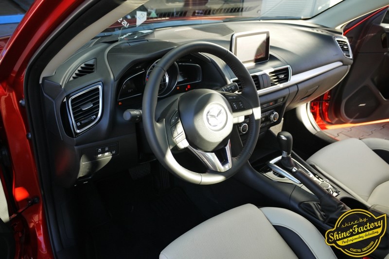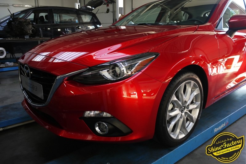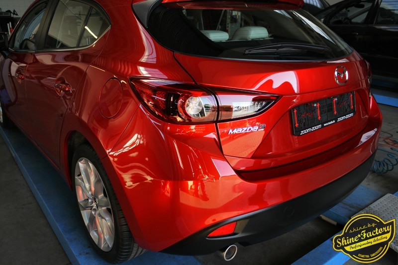Witamy Was. Dziś chcielibyśmy pokazać Państwu relację z prac nad przygotowaniem do premiery najnowszej Mazdy 3. Dzień przed premierą Mazda zaprosiła nas do salonu abyśmy przygotowali auto aby prezentowało się jak najlepiej na premierze następnego dnia. Auto zastaliśmy dość czyste, jednak detale wymagały zdecydowanie pracy aby auto wyróżniało się na scenie. Na lakier został zaaplikowany maszynowo Glaze który odżywił lakier, za finalny połysk i głębie koloru odpowiedzialny był wosk Swissvax Concorso. Wnętrze zostało w każdym elemencie zabezpieczone odpowiednimi dresingami a skórzana tapicerka wymagała oczyszczenia i impregnacji. Komora silnika była bardzo zabrudzona, została oczyszczona i zabezpieczona. Po zajęciu się wszelkimi innymi detalami jak felgi, opony i inne elementy nielakierowane auto prezentowało się wyśmienicie. Na następny dzień przyjechaliśmy jeszcze na miejsce premiery aby dopilnować idealnej prezentacji auta. Zobaczcie to sami w relacji, zapraszamy!