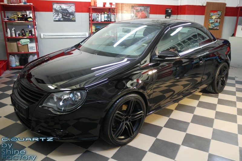 Witamy! Dziś chcielibyśmy pokazać Wam pełną fotorelację z prac nad VW Eos z wielkim silnikiem VR6 oraz niemetalicznym czarnym lakierem. Lakier ten po kilku dniach korekty z mocno porysowanego i zmatowiałego, zmienił się w klarownie przejrzystą czarną powłokę o lustrzanym odbiciu. Po korekcie został zabezpieczony w najlepszy sposób powłoką kwarcową. Nie omieszkaliśmy się zając wszelkimi innymi detalami, które dopełniły idealnego efektu końcowego, zajęliśmy się kołami, nadkolami, elementami nielakierowanymi, szybami czy też elementami układu wydechowego. Zajeliśmy się także wnętrzem, którego wszelkie elementy zostały oczyszczone i zabezpieczone odpowiednimi kosmetykami. Zapraszamy do pełnej relacji i zdjęć z efektu końcowego!