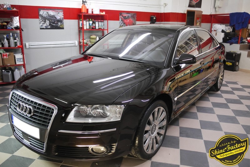 Witamy i tym razem zapraszamy do obejrzenia pełnej fotorelacji z prac na piękną i ogromną limuzyną marki Audi A8. Przy aucie wykonaliśmy pełen pakiet detailingu, zajęliśmy się każdym elementem auta. Zaczęliśmy od ściągnięcia z auta kół w celu oczyszczenia nadkoli oraz felg od wewnątrz które zostały zabezpieczone odpowiednimi kosmetykami. Następnie dogłębnie oczyściliśmy zabrudzone nadwozie. Po tych czynnościach przeprowadziliśmy pełną korektę lakieru pozbywając się niedoskonałości co dało nam klarowny wygląd, połysk i głębie koloru. Dla najlepszej ochrony auto zostało pokryte finalnie powłoką kwarcową. We wnętrzu oczyszczone zostały wszystkie detale wraz ze skórzaną tapicerką, każdy z elementów został zabezpieczony odpowiednimi kosmetykami. Zajęliśmy się także komorą silnika. Po detailingu najdrobniejszych elementów na zewnątrz auto zyskało idealny wygląd. Wszystko to zobaczycie w relacji, zapraszamy.